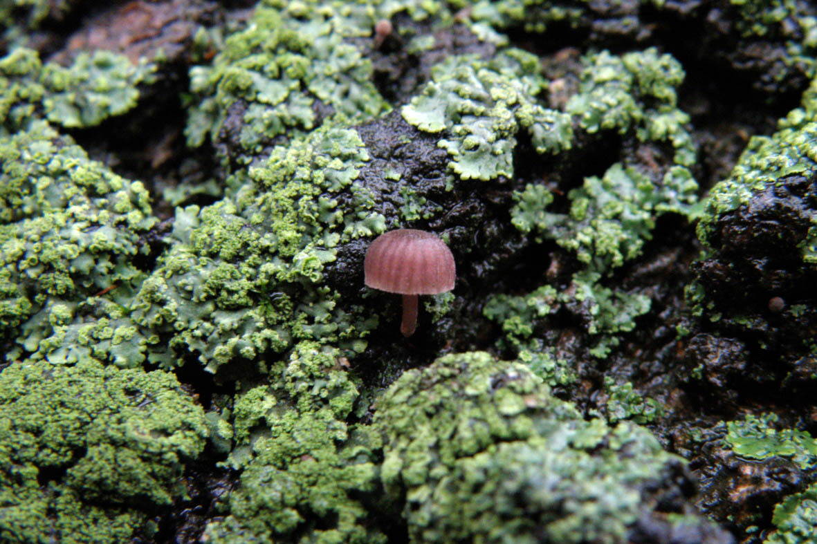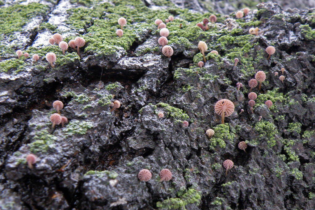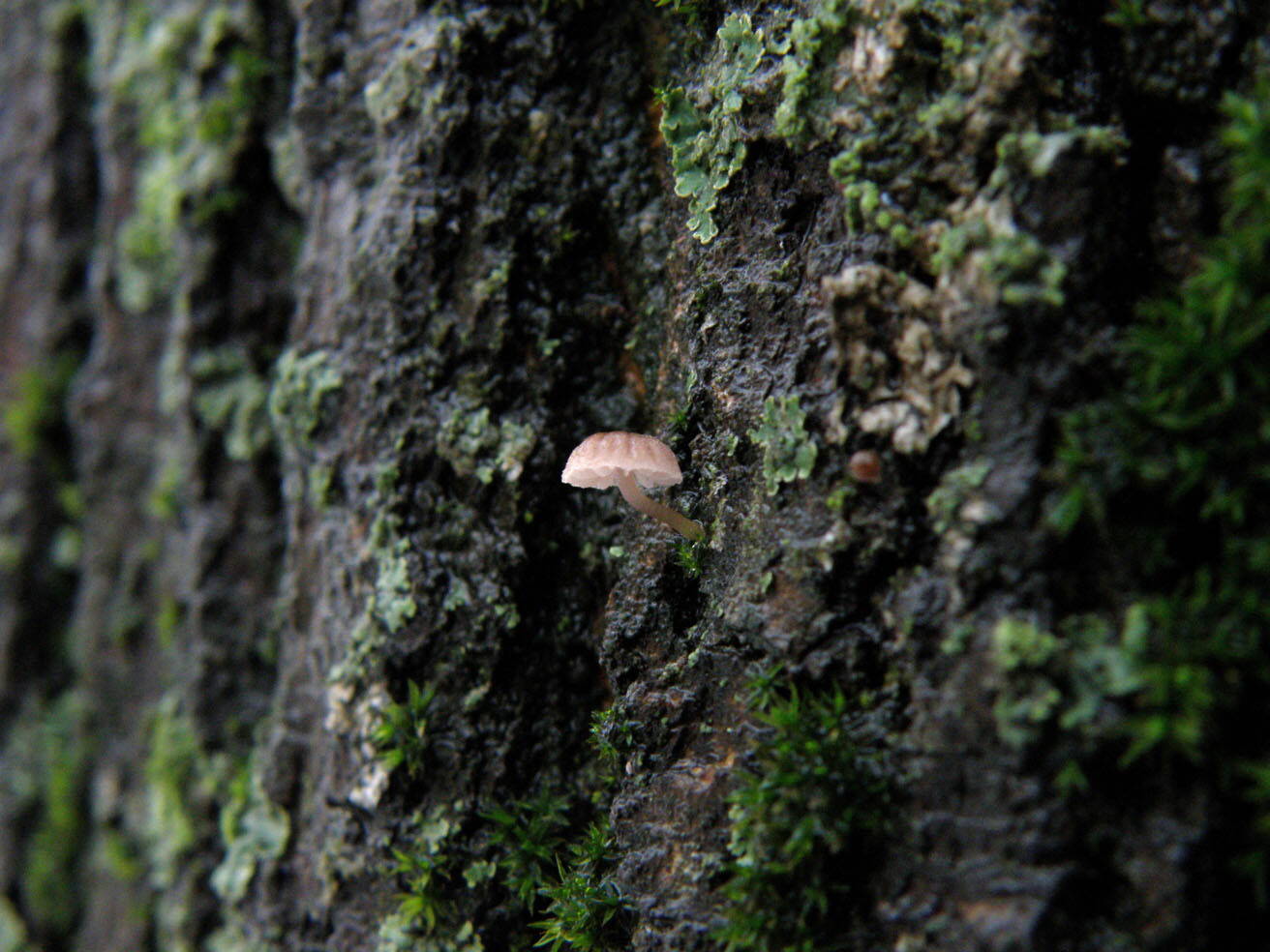 А это "Новогодний гриб" :) . Сфоткал сегодня на Павловом Поле. Диаметр шляпки 2 - 4 мм!!! Растут прямо на коре деревьев (клёнов). Они питаются корой деревьев, также как и эти зелёные лишайники. А плесневый гриб на последнем фото поедает уже сами лишайники. Вот такая цепочка питания.