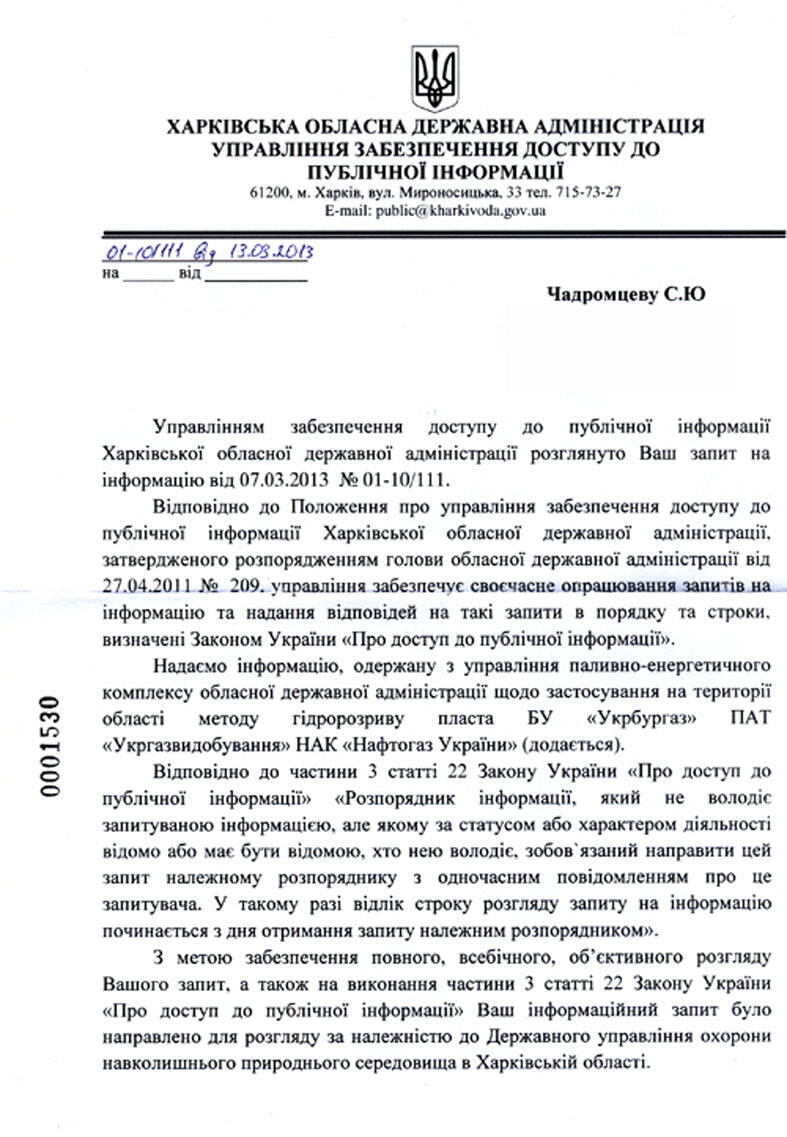 Ответ Харьковской облгосадминистрации пришел 13 марта (см. Документ 2.). Этот ответ учит нас, неразумных, особенностям отечественного законодательства, повышает нашу эрудицию в ряде вопросов, но сутью своей имеет констатацию отсутствия у областных властей какой бы то ни было информации. А запрос наш переадресовывается Госуправлению охраны окружающей природной среды в Харьковской области. Плюс — в качестве бонуса таблица от управления топливно-энергетического комплекса ХОГА, пришедшего областному начальству от БУ «Укрбургаз». Простите, но мы-то спрашивали совершенно о другом. Мы, напомню, спрашивали о расстояниях от скважин до населенных пунктов, координатах скважин и т.д. Получили просто перечень скважин, с которым сложно что-либо сделать… Согласитесь, на «все данные находятся в свободном доступе» как-то не похоже…