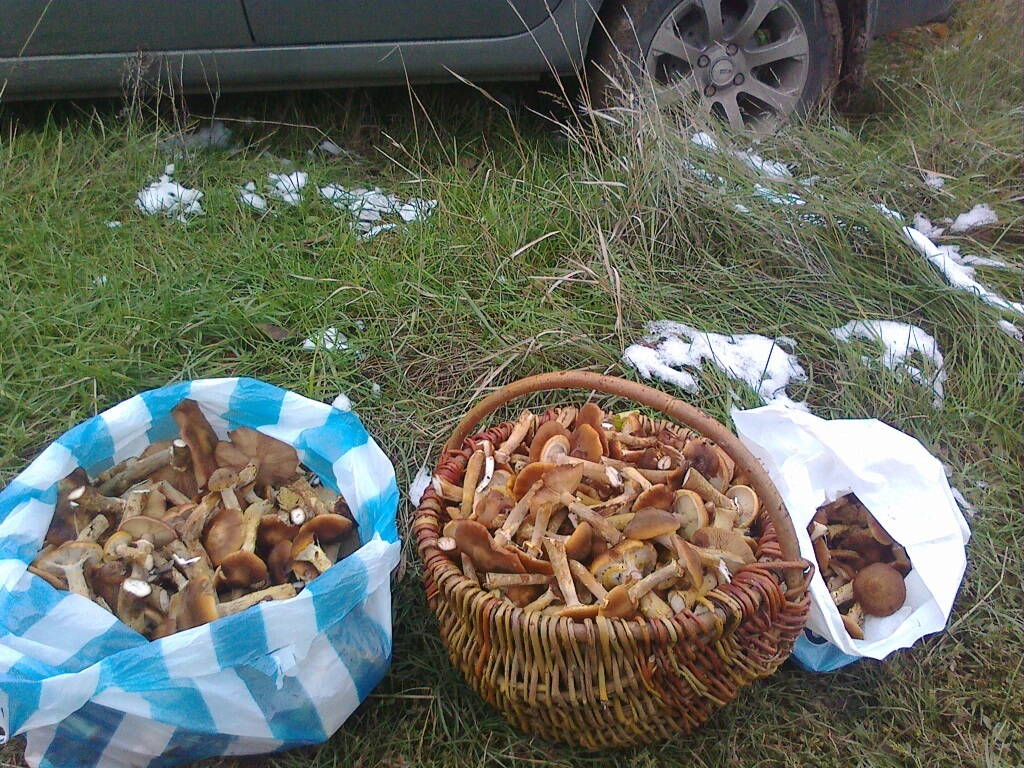 Сегодня в дергачевском лесу собрали чуть более 6 кг опят за довольно короткий промежуток времени. Немного необычное впечатление когда местами лежит снег.