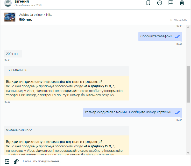 Тут треба трішки напружувати мозок та самому думати про себе, щоб не обманули. Бо якщо сам про себе не попіклуєшся, ніхто інший тим пачє не буде піклуватись. Я навіть не розумію за що та з яких таких причин для відправки кросівок потрібна предоплата. Це не габаритний та не важкий товар, проблем ніяких немає, та з ОЛХ доставкою обидві сторони захищєні, просто за що можно було просити предоплату, тупо не розумію.
