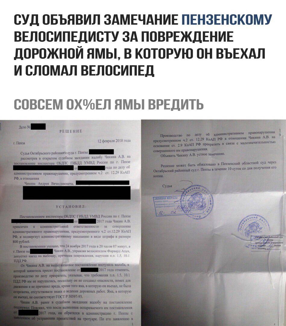 Очень порадовала фраза из "Решения суда" - "Яма, в которую он въехал, не соответствует ГОСТ Р 50597-93. ГОСТ НА ЯМЫ - вот, воистину "дураки и дороги"© :ROFL: