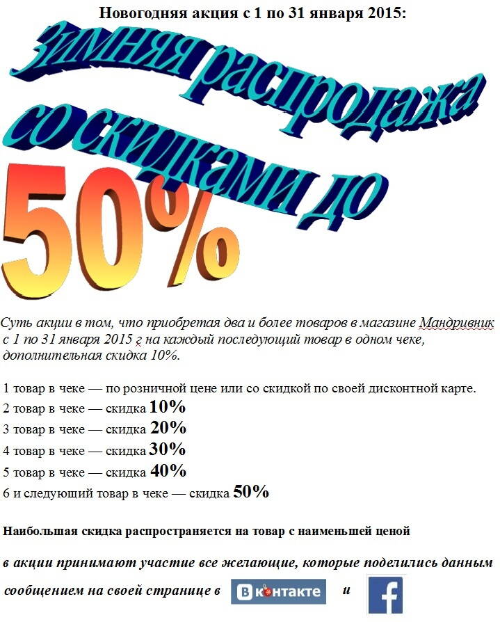 Акция будет действовать и для покупателей нашего интернет-магазина: на этапе оформления заказа укажите промокод «WINTER-SALE-2015» в поле "комментарии к заказу".