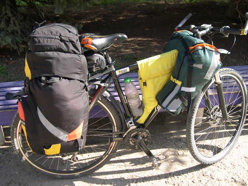Ну и это, сумку под седло - это именно для поездки с малым количеством веса. Для похода с заметной автономкой скорее всего пошью теперь узкие штаны на багажник, чтобы ногами не цепляться, когда толкаешь велосипед в горку. Тем более практически все фирменные баулы висят даже выше втулок. Себе как раз постараюсь сделать хотя бы на 8-10см ниже втулок (лишь бы перекидку заднюю не цепляли) - это должно очень позитивно сказаться на управляемости. Надо только предварительно Лешу тщательно расспросить, он год назад уже обкатывал самодельные сумки-гермы, которые были заметно ниже фирменного баула: