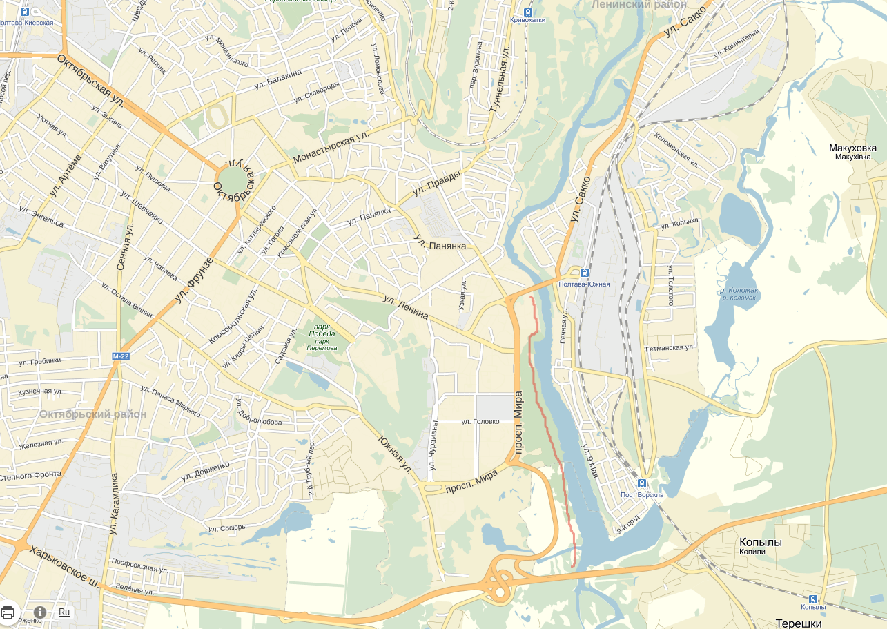 возле Южного железнодорожного вокзала вдоль берега реки Ворскла - если с палатками едете, то места там много и к городу близко :smile: