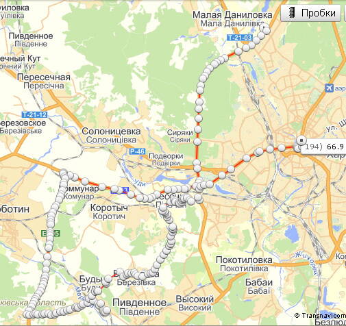 Окружная дорога - Песочин - далее по трассе до новой трассы Москва-Симферополь "Р-51" - по ней до пос. Быстрое - Бердяги - Буды - Березовка - Олешки - мимо санатория Роща - Песочин - мкрн. Савина гора - Окружная - Полтавский шлях