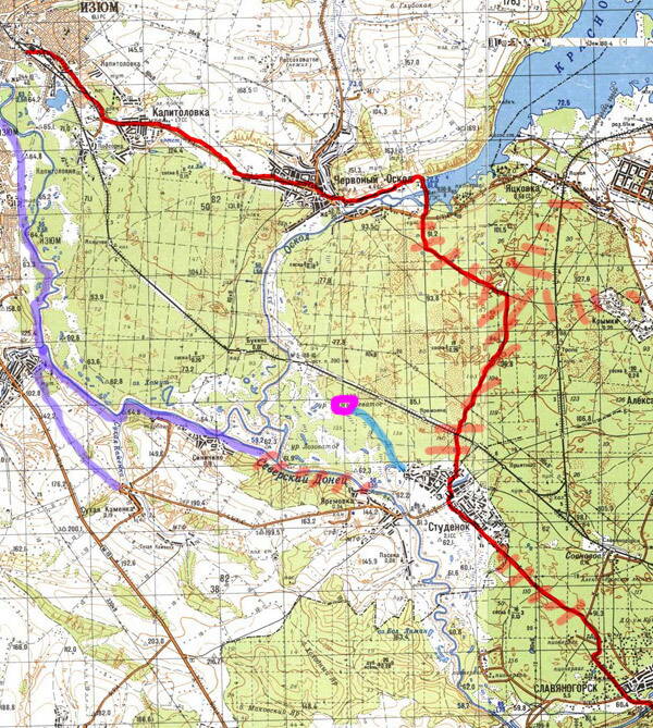 Советы. Кто захочет проехаться нашим маршрутом, не пожалеет.Старайтесь миновать по возможности трасу от Изюма до Славянска. Очень опасная дорога. Узкая, горка-спуск , обочина убитая, одни фуры летают. Только не рассчитывайте, что вы сядете на скоростные электрички в воскресенье. На них едут одни студенты в Харьков и билеты уже раскуплены за неделю вперед. На карте я отметил дороги перечеркнутым, которые непроходимые. Синим и фиолетовым тропинки и дороги проходимые. Кружок это термальный источник.