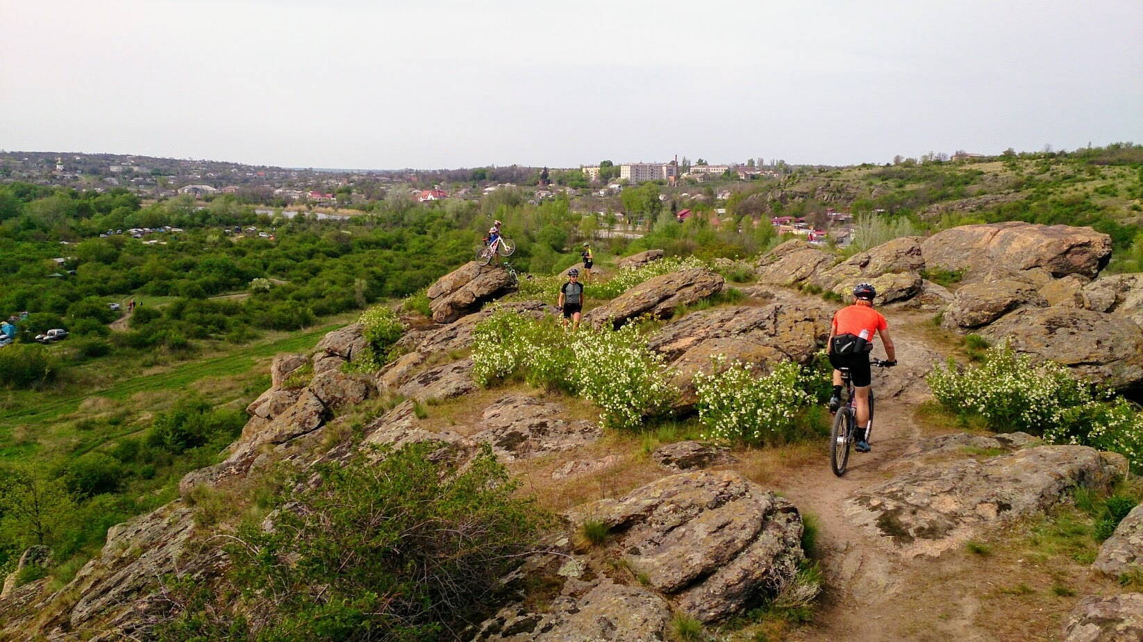 107 км, Гранитно-степное Побужье во всей красе. 08:00 утра, день снова начался с переправы на другой берег, данный паром и лодка для с. Богдановка единственный вид транспортного сообщения с Южноукраинском на другом берегу, так как до ближайших мостов около 70 км в обе стороны. Работает это сообщение круглосуточно. В этот день нам предстояло проехаться по двум берегам Ю.буга с множеством мест посещения, программа была плотной как и приличное расстояние + общая сумма набора высоты. Передвигаясь правым бережком имели возможность лицезреть на множество красивых мест Ю.Буга и его пороги. Побывали в селе под названием Львов. Населенный пункт в 1,5 улицы, но площадь "Рынок" не нашли и поехали дальше. Присутствие своих очень часто нами встречалось, на одном из последних домиков улицы висел флаг ДУК ПС, в Первомайске у берега реки встретили джип с номерами ДУК ПС =_)). Для экономии времени, к руинам более-менее сохранившейся старой мельницы не спускались, осмотрели сверху и продолжили путь к кишиневской трассе к следующей точке - бывшей части РВСН с ШПУ для Р-14. Но, добравшись туда смотреть уже было не на что, вся территория зачищена и рекультивирована кроме одного почти раздолбанного на металл арочного подземного хранилища по типу как у нас под Эсхаром на бывших позициях ПВО С-200. Дальше по направлению к берегу Ю.Буга уперлись в немалую табличку 2*1 м, что проезд/проход запрещен из-за использования данной территории Министерством обороны. Не став испытывать судьбу =_)), скорректировали маршрут полями и выехали в пригород Первомайска в с.Грушевка, где и вернулись на трек вдоль берега реки. Пообедав в местном кафе Первомайска вышли на обратный путь через жд.мост по левому берегу Ю.Буга. Веселым рельефом вверх/вниз оказались в н.п. Мигия, место "паломничества" любителей рафтинга. У старой Мигийской ГЭС есть возможность посмотреть на преодолевание и сплав по порогам. Немного дальше к выезду из Мигии есть кряж, на который стоит подняться, чтобы полюбоваться видом извилистых порогов Ю.Буга и прилегающих территорий. У подножья этого кряжа расположен большой палаточный городок рафтеров. Поднявшись от этого места несколько сот метров по николаевской трассе вверх попадаем на обустроенную смотровую площадку "Радоновое озеро". Это бывший глубокий гранитный карьер запыленной бирюзового цвета водой с высоким содержанием радона. Спустившись к реке маршрут начался более веселым, начали передвигаться еле заметной тропой огибающей складки каменистого берега, где пешком круто вверх, где на веле круто вниз до слышимой гари нагретых тормозных дисков. И вот мы вылетам из кустов сверху в тихий умиротворенный лагерь туристов :-P, казалось бы уже вырвались на большую грунтовую дорогу накатанную автомобилями, а нет, дорога эта убежала от нас резко вверх под 90 градусов. По треку дальше 4 км участок тропы вдоль Ю.Буга, ожидания были на ее - живописно проехаться до кишиневской трассы. В итоге ожидания сменились "тяготами и лишениями" - 1/3 этого пути пешком через заросли и буреломы растительности, 2-ые 1/3 режиме старт-стопа, где пытались уже ехать, где перебирались через бревна и ветки, и последняя 1/3 ехали уверенно, местами правда по шлем в кустах =_)). С облегчением увидели мост, который является одним из высоких в Украине (35 м) и небольшим серпантином в несколько витков поднялись на 