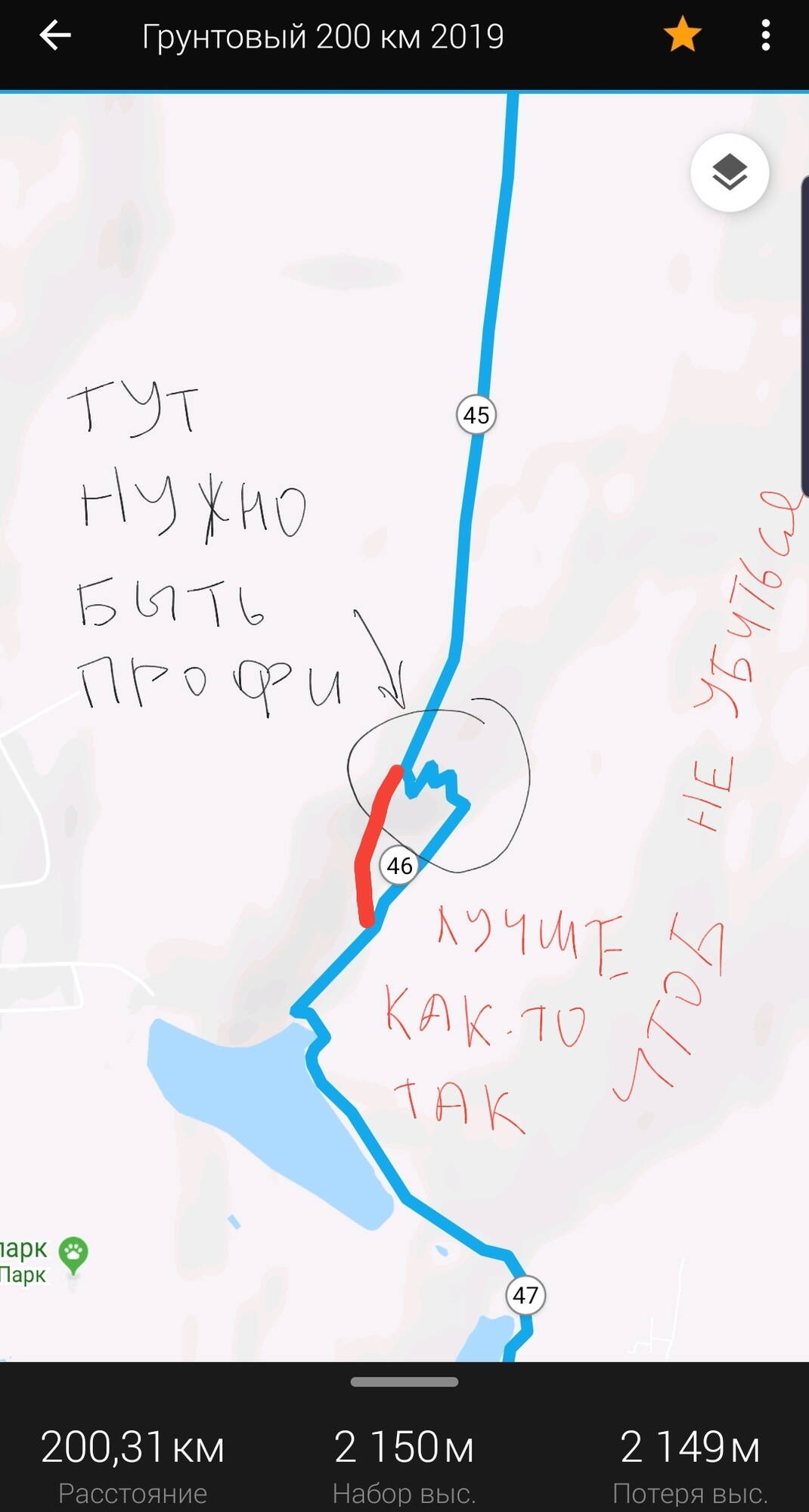 С 45-46 км участок гоночной трассы. Там не хилый треил. На нём можно убиться если не знаешь как ехать или ранее на нем не катал