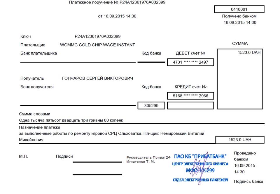 ОТЧЕТ О ДВИЖЕНИИ ДЕНЕЖНЫХ СРЕДСТВ НА КАРТЕ 4731 2171 0417 2497 ПРИВАТБАНК