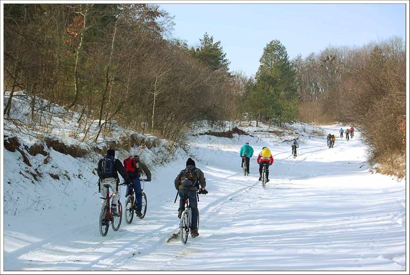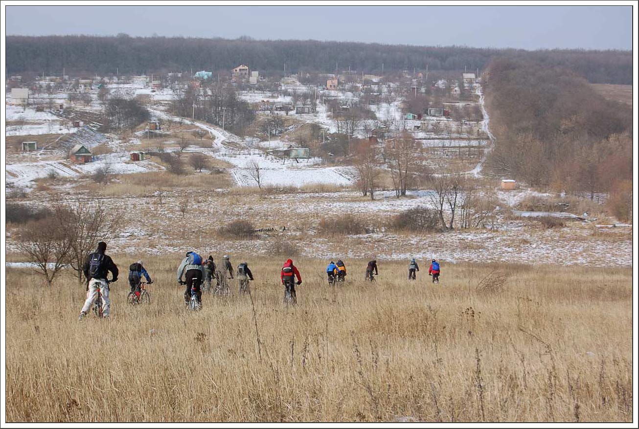 Последний день зимы нас встречал пасмурной погодой, но дороги были сухие, так что до места старта думаю все добрались быстро и чисто. Уже издали я увидел рюкзак Паши - без отличных фото не останемся :-) . А затем и показались остальные всадники металлических коней - все свои знакомые и друзья. Немного байкерских разговоров, что бы скоротать время до старта. Харьковское время 9:00, колонна велосипедистов трогается в путь. Еще сухой проспект Гагарина интригует двигаться быстрее - но скорость четко ограничена вышеуказанным темпом, за этим пристально следит начальник покатушки :-) . Сворачиваем к овоще фабрике или же ко всемизнакомой дороге к безлюдовским пляжам. Асфальт покрыт коркой льда - мы двигаемся осторожно, на этом участке все обошлось без падений. Приближаемся к озеру и тут моя цепь не выдерживает. (Что ж что поделать за последние три недели убеждаюсь что срам 991 полное фуфло.) Быстрый ремонт, стоит отметить помощь мохнатого ассистента :) , который не давал скучать остальной части команды, и мы снова в пути. Прокатились по льду безлюдовского озера, к счастью оно никого не приняло к себе в пучину. Двигаемся дальше, через жд и вьезжаем в лес. Лес встречает нас небольшим слоем снега, но все же это затрудняет движение, с этого момента Дима начинает наращивать темп, а вернее не дает ему упасть. Лес пахнет хвоей, чувствуется приближение весны. Ехать приятно. Скорость не дает мышлению заснуть, надо все время анализировать трассу иначе можно оказатся в обьятиях сосны :-) . Впереди колесо Димы, я не могу позволить себе отстать. Вот и Хорошево, перезжаем через Уды, двигаемся улочками Хорошево, которые приводят нас к подъему, на котором нам часто попадались ветки, загораживающие путь, но нас, смелых и отважных, такие мелочи не могут остановить. Упираемся в сад. тов., за шлагбаумом на нас смотрит сторож, у которго на лице написано, то же, что и думает шлагбаум :-): "Вам здесь нет прохода". Заснеженная тропинка - наш единственный выход. После нескольких минут вело таскания-ношения, мы садимся в седла, дальше можно ехать. Так мы плавно вьезжаем в Черный лес, в котором, со времени снегопада, кроме нескольких человек никого не было. Включаем легкие передачи и медленно но уверенно двигаемся навстречу приключениям, я вырываюсь немного вперед, позади уже не слышно голосов, я наслаждаюсь тишиной таинственного леса. После затяжного подъема делаем привал, что бы пополнить силы и подождать остальных. Кроме нас, по лесу рыскала и зелная нива, но ее колии были не достаточно твердыми что бы ехать по ним уверенно. Снова в бой с рыхлым и коварным снегом, который то и дело зарывает твой байк по самый переключатель. Андрей Борода на своем триальном веле чувствует себя лучше всех - его байк легчее всех проходит заснеженную трассу! Вскоре мы прощаемся с Черным Лесом и его тропами, двигаясь к следующей точке нашего маршрута - Александровке. Между Аксютовкой и Островерховкой на асфальте попадались очень скоростные участки, на которых было где оторваться. Далее двигаемся полями - на них уже подтаял снег и выглядывает чернозем, от этого вел и сам ездок постпенно чернеют :-) . Поля поражают своей красотой. Их безграничное пространство дают тебе чувство свободы и тебе хочется двигатся еще быстрее, приближая к себе горизонт! Плавно уходящие края полей сменяются лесами, особенно это эффект
