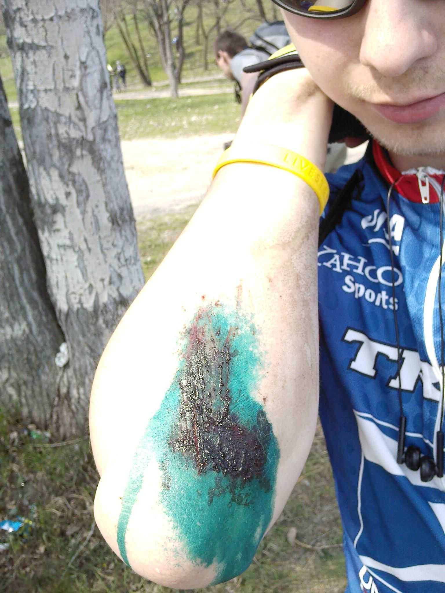 Были и падения. Одно падение по невнимательности было с моим участием на высокой скорости (благо на грунтах): в тот момент, когда я встретился с землей, я заметил как мой конек продолжает полет, он приземлился в нескольких метрах от меня – сия картина доставила мне нималую боль; сам я вышел сухим из передряги, не считая ссадины на локте - кстати резко зауважал термик и рейтузы Gordana, а также и перчатки (не сочтите за рекламу), которые существенно защитили, при этом оставшись целыми без видимых повреждений. Коньку тож досталось: ох... восьмерка на переднем (Дима Виннер респект!!! - в считанные минуты восстановил практически до идеала, Швинопас тож респект за инструмент и оптимистический настрой) и погнутый петух, оный был также деведен до нормального состояния самотужки. Этот полет привел в состояние полной внимательности и собранности. LeN1n тож получил свою порцию: у нас даже появился новый способ приветствия путем поднятия правого локтя к оппоненту.