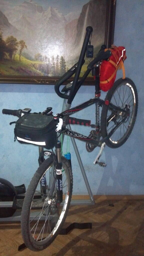 Упаковался. Вся снаряга потянула 4 кг без еды и воды. (+9,45 кг вес самого вела)=13,45кг. Взвешивание вела с обнулением весов в подвешенном состоянии без раскачки и без вела показал -13,40 кг - что на мой взгляд является более точным чем подвешивание болтающегося вела, когда вес фиксируется на весах непонятно в какой момент.