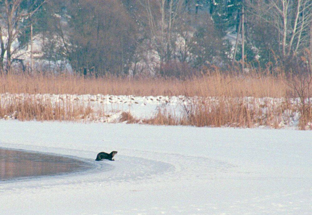 В прошлом году тоже наблюдал в том месте следы на льду, не похожие ни на норочьи, ни на лисьи - предположил, что это может быть все та же выдра :)