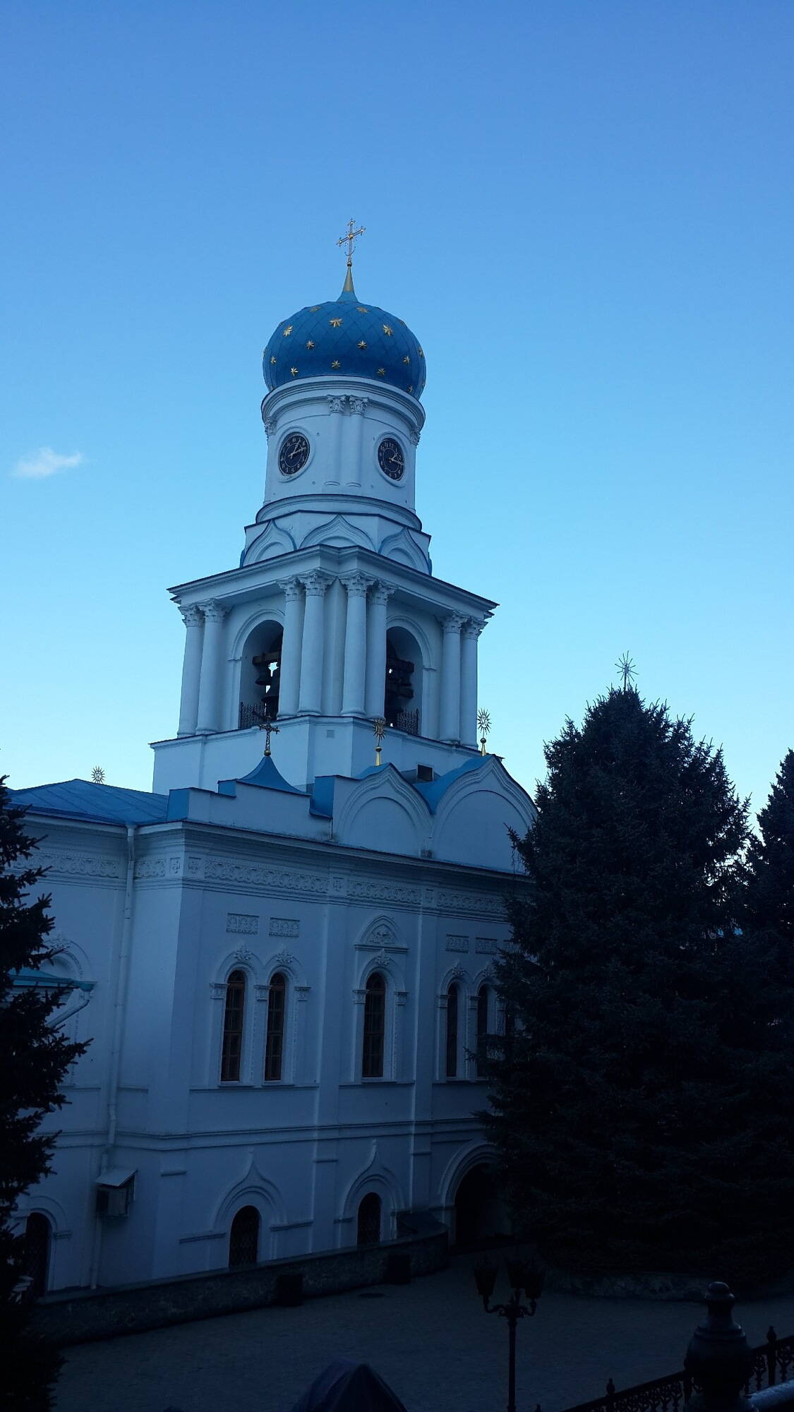 Когда я впервые попал в Святогорск, меня сильно удивил символ двойной молнии, устремленной вверх и в стороны, вместо креста на одном из куполов - этот купол имеет форму восьмигранного вытянутого "колпака", но самое навершие у него теперь тоже позолочено. Символ сей меня настолько удивил, что я даже спросил о его значении у кого-то из местных служителей; полного объяснения я не запомнил, но почему-то пришел к выводу, что это какой-то, причем не совсем православный и христианский оберег...