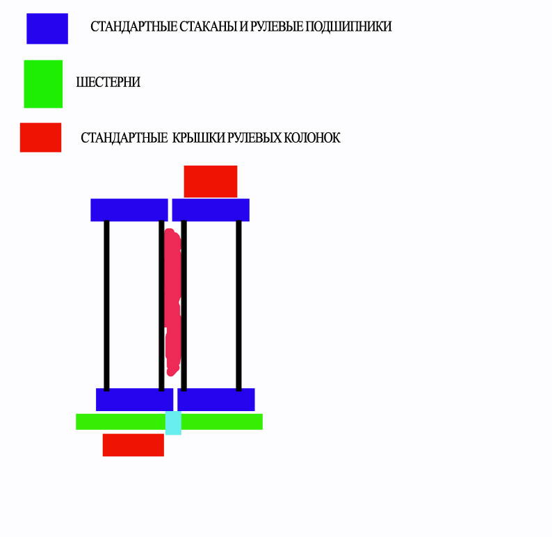 Две безрезьбовых рулевых колонки сварены. На шток вилки одета проставка, шестерня, проставка, всё это вставлено в рулевыю и сверху прижато обычной прижимной крышкой.
