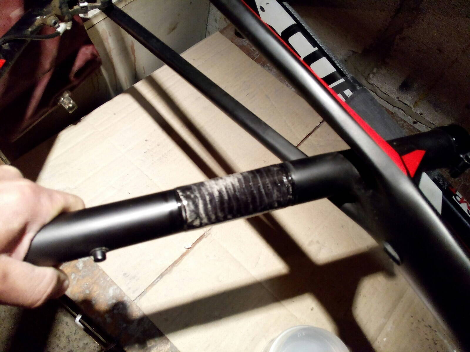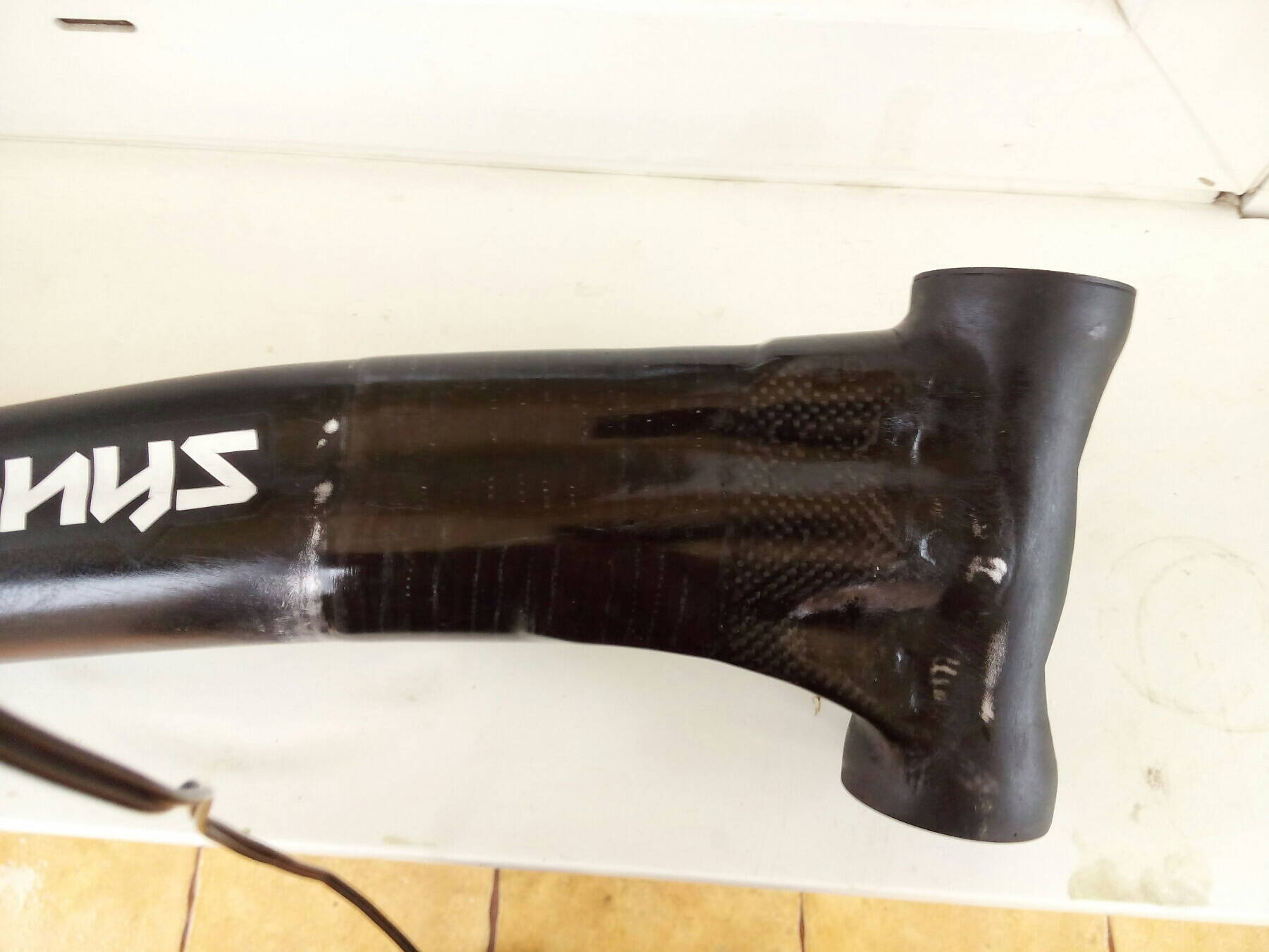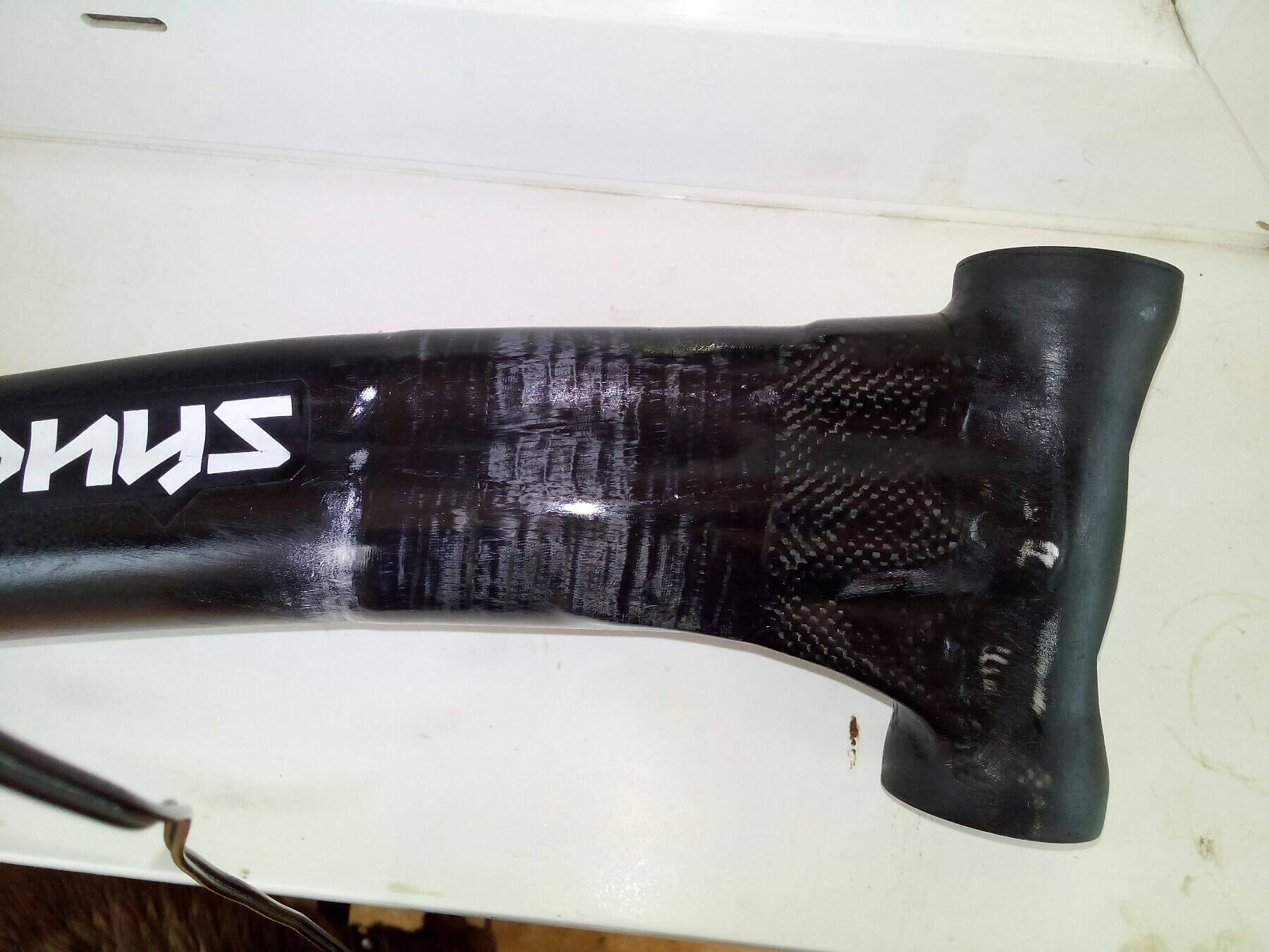 Заваренно, отшлифовано и затем обмотано карбоном и подготовлено к покраске с отшпаклеванными переходами с карбона на алюм.трубу.