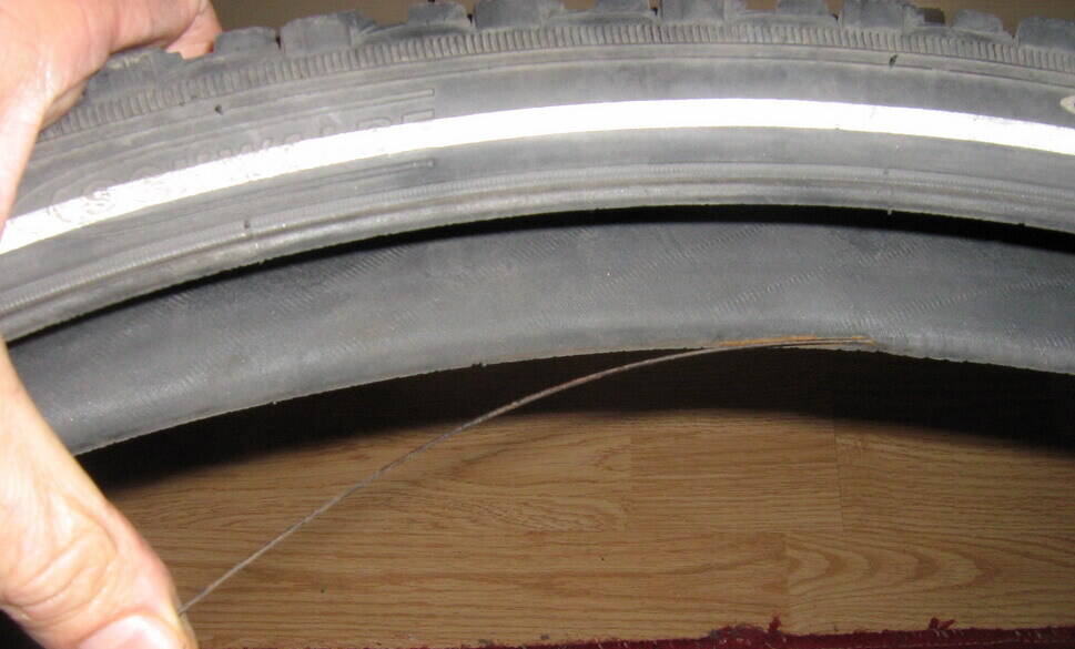 3. Почему и как это произошло- до сих пор не понимаю. Во-первых, прокол был незадолго (км за 50?) до этой беды, так что покрыху я снимал и проблем не было. Во-вторых, не видно, откуда корд вылез. Я вначале , удивившись, решил, что это что-то чужеродное :). И вдруг- и на такой длине... ???