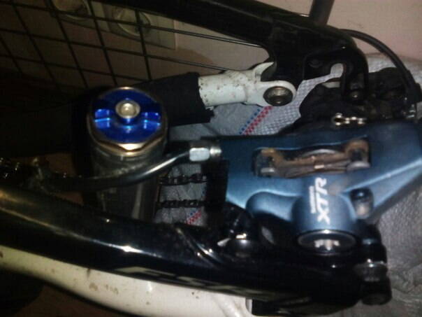 На новом фреймсете вылезла проблема с задним тормозом . Расширительный бачок аморта который крепиться на пере слишком близко к калиперу тормоза , из-за чего изгибаеться гидролиния у самого входа в калипер .