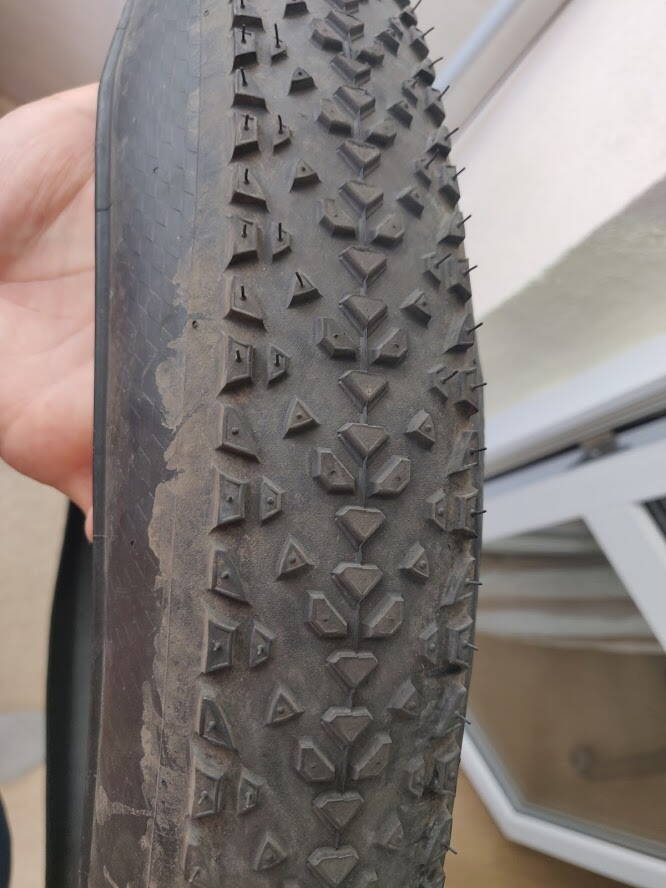 Как видите, асфальт и большое давление стирают мягкую, фолдинговую покрышку.
