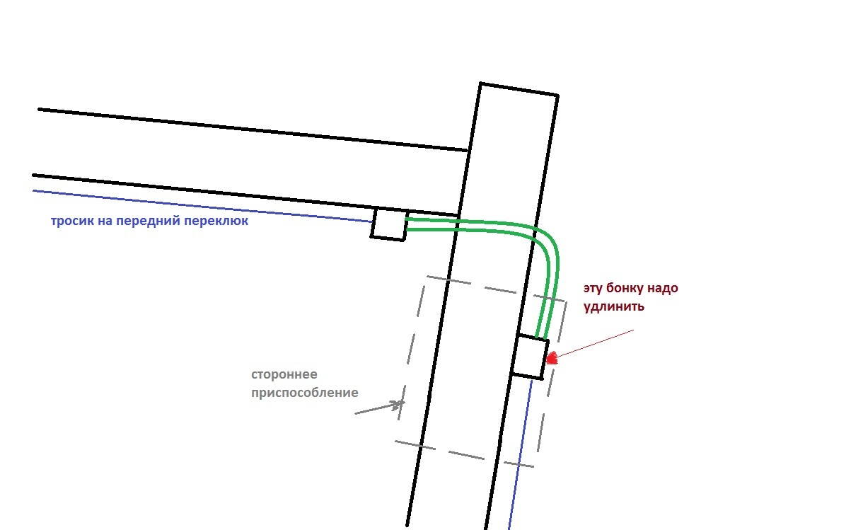Якщо дійсно перекривається можливість використовувати одну з бонок рами - треба перенести місце упору, тобто бонку. На кресленні зелене - це оболонка тросу, вона з обох боків повинна мати жорсткий упор щоб перемикання працювало. У моїй пропозиції додається ще одна бонка ніжче позиції існуючої, оболонка тросу (зелений сегмент) ставиться відповідно довший. Функціонування залишається незмінним.