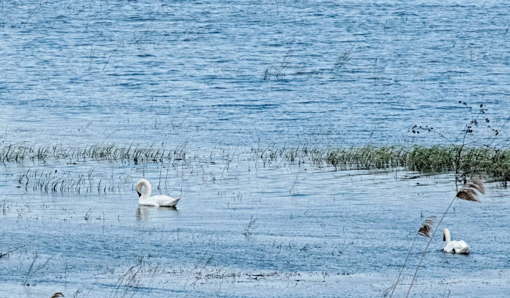 Когда двинулся по дороге дальше, оказалось, что под берегом плавает ещё парочка лебедей. Попытка подобраться на нормальный "выстрел" телевиком, однако, показала, что птицы весьма умные, и хотя меня за холмиком они видеть не могли, но на всякий случай отплыли от берега подальше :)