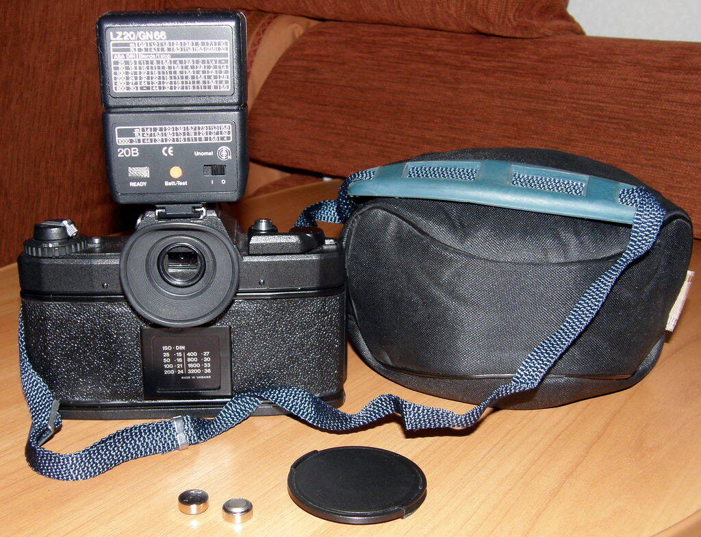 Фотоаппарат, ремень, мягкий чехол, вспышка.