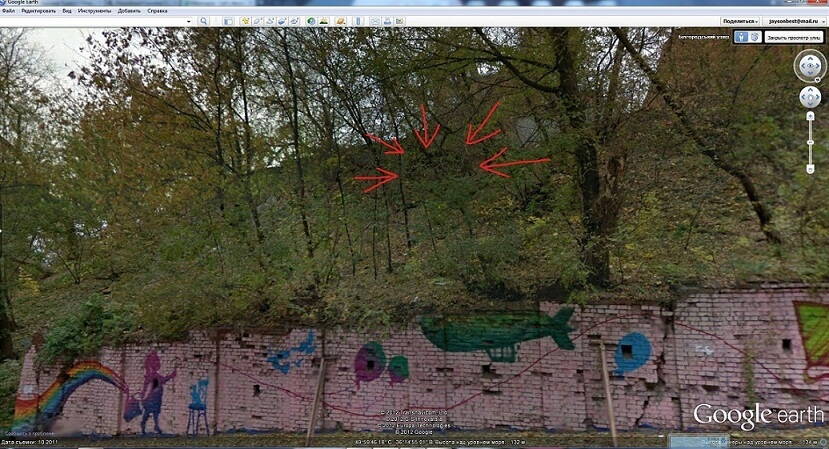 Фото к сожалению нет, когда я его увидел телефон без фотика был. но если в Гугл планета земля включить просмотр улиц и присмотреться на место на карте, обьект немного видно сквозь листву. Находится на Белгородском спуске, если спускаться, то справой стороны.