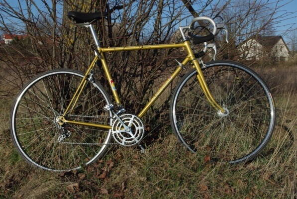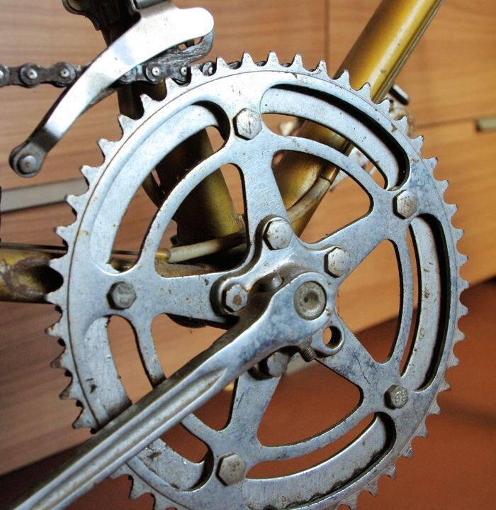 передний переключатель высоко от звёзд стоит.Расстояние от нижней кромки переключателя до окончания зуба большей звезды 2-3мм.А рама всё таки 81 года.Переключатель задний вообще антиквариат.Будет ходить ещё долго.И с обмоткой на руле ездить приятнее :smile: