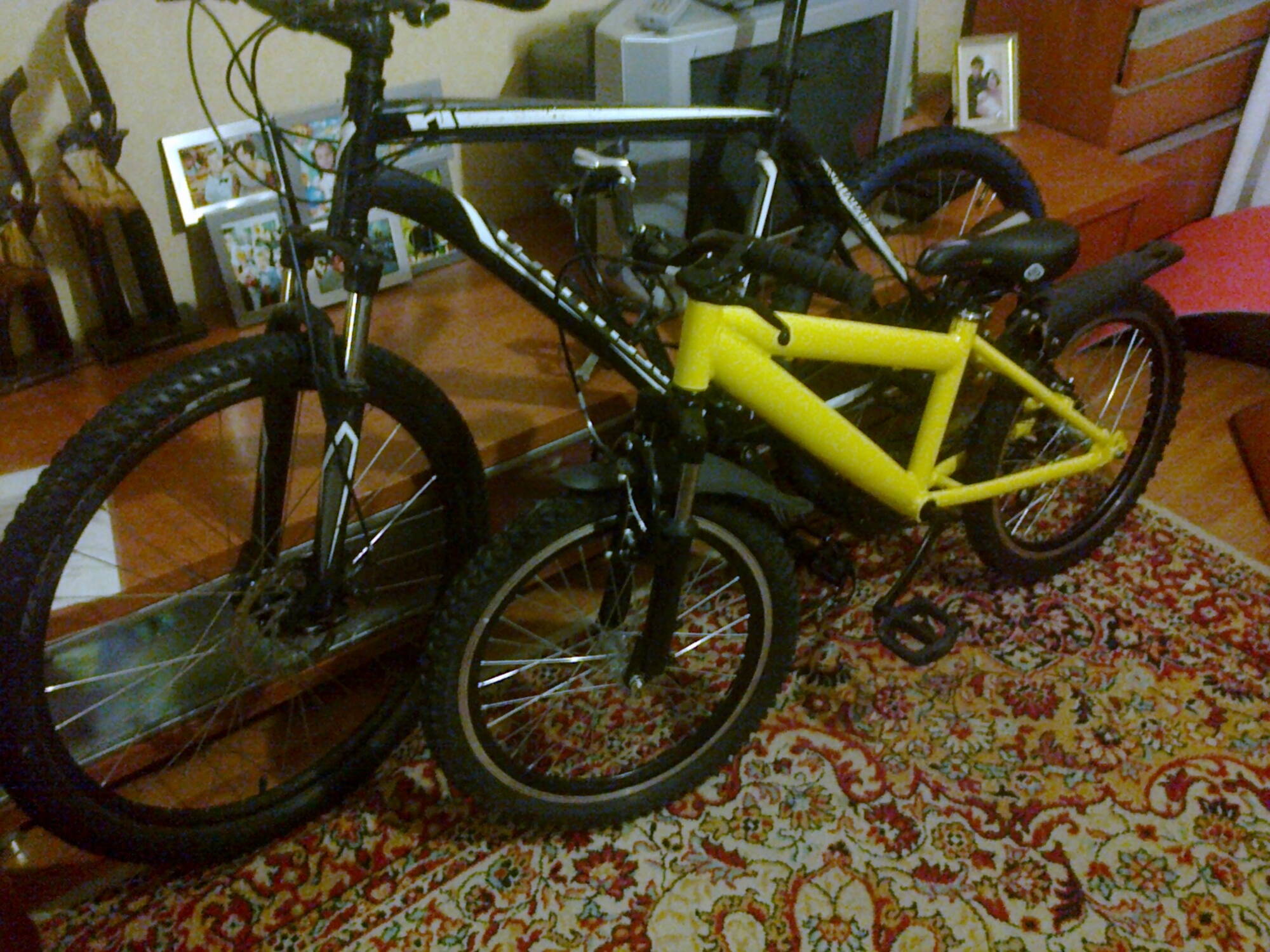 Странно, что на"взрослой" раме нет усилителя в месте сварки горизонтальной и подседельной труб (остальные присутствуют), да и геометрия задней части от "Элит 2" отличается, возможно это какая то переходная модель или Гена из "Bike sanatory" конструировал что то свое. Хотя мою раму, в свое время, наличие усилителя от трещины все равно не спасло (аккуратно треснула над ним) - теперь висит в мастерской как воспоминание (катила здорово, особенно в горку). Фото еще живого аппарата на предыдущей странице в этой теме(там хорошо видно отличия "Элит-2" от Вашей рамы) viewtopic.php?f=23&t=13957&start=30 . Кстати, если не секрет, за сколько удалось купить детскую раму? Хотел в свое время ее купить, но показалось, что она под 16" колесо (померять было нечем и смотрел в темноте), зато рассказал ребятам, что они продают. Потом как то замотался и покупка не сложилась. Кстати, велик у Вас получился симпатичный.