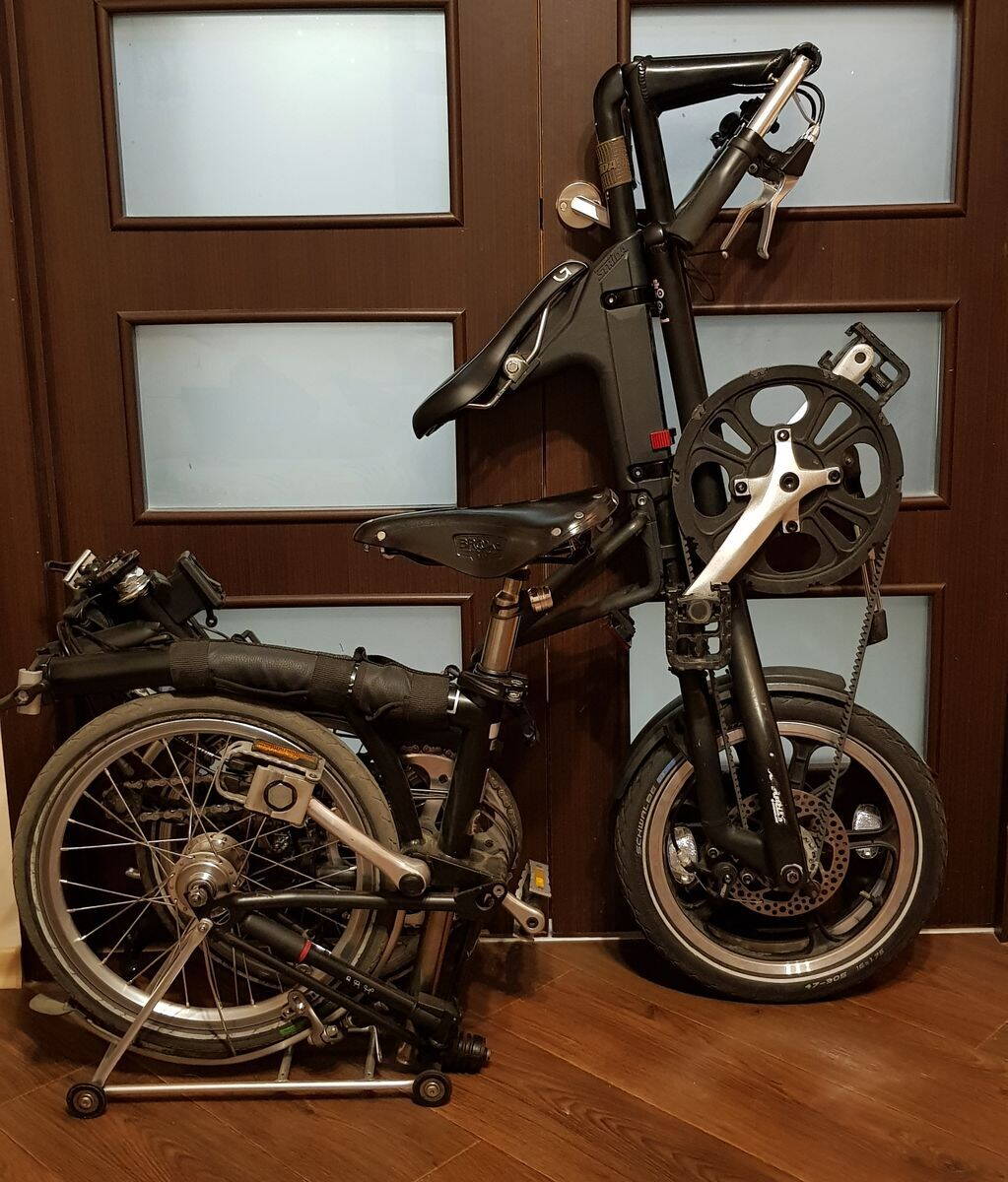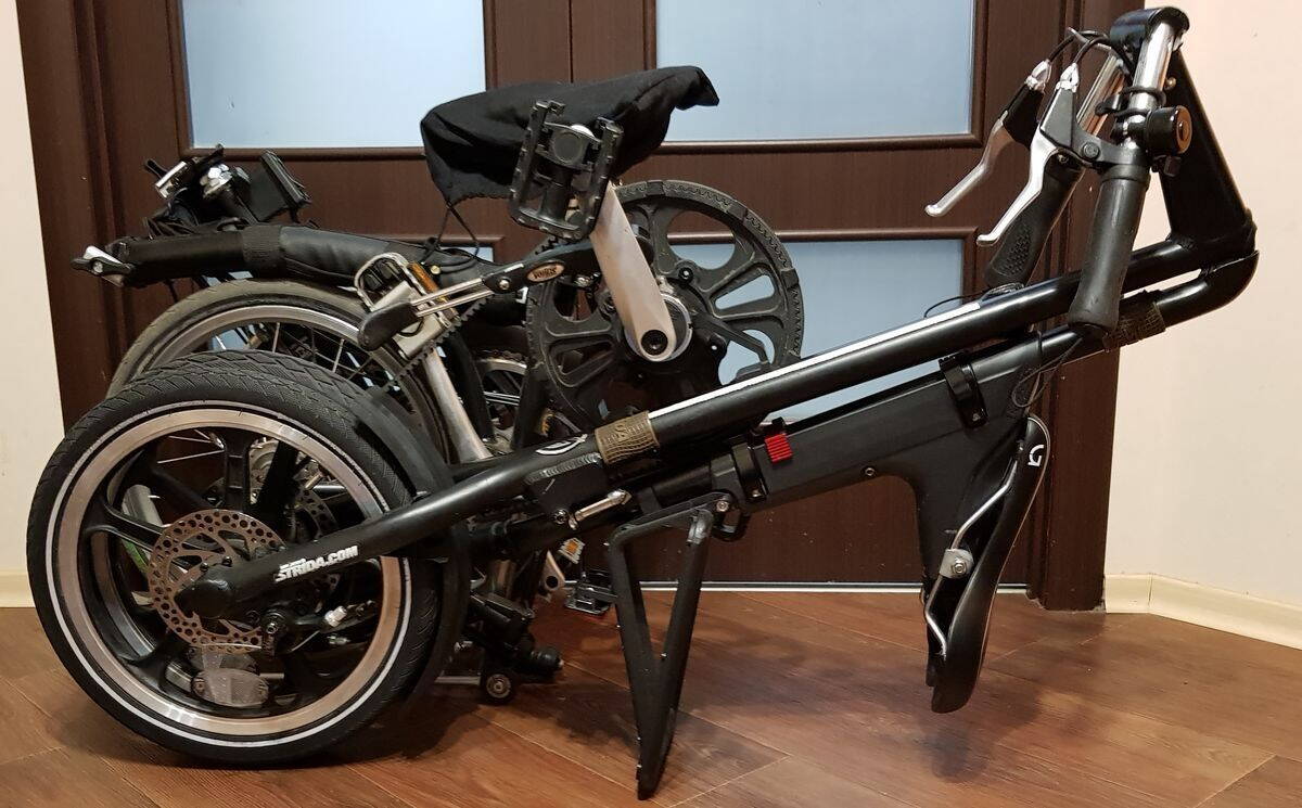 - перемещение в сложенном состоянии. Немного нужно приноровиться (снять фиксатор с одной ручки тормоза и слегка наклонить вел), но при перемещении постоянно одна рука занята. Как Бромптон, катить перед собой на багажнике в виде тележки для супермаркета, не получится.