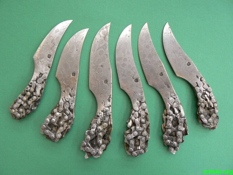 Цепь явно от бензопилы, и не обернув рукоять - шкуру на ладони порвешь на раз. А обернув - Крррасоту погубишь. Режет такой клинок весьма неплохо, материал распространенный и доступный, из минусов - приходится его ковать толстым, чтоб был достаточно прочен на изгиб, и ржавеет тоже стремительно. Последнее возможно из за того материала что был на виденном мной в школьные годы у учителя труда - там была как раз велоцепь. А урок был - о кузнечной сварке и наварке. Такому бы материалу - да форму как у кхукри - самое оно, и куст мешающий снести, и лучины наколоть, да и забить что либо по шляпку - тоже неплохо, и полегче топора. А для велотуризма - маленький и елико возможно легкий, и копеечный.