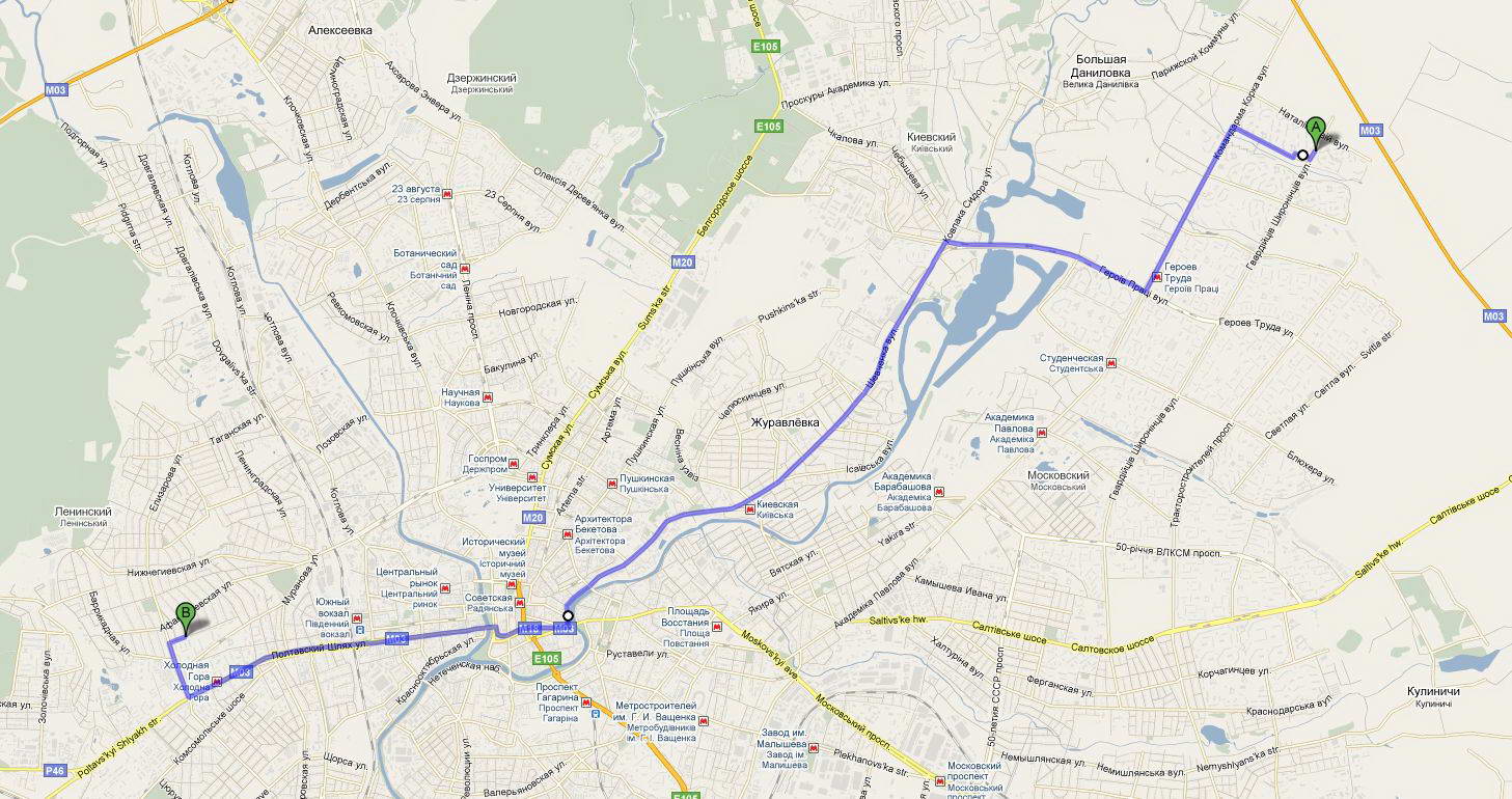 м. Героев труда - ул. Героев труда - ул. Шевченко - Московский проспект - пл. Розы Люксембурга -Полтавский Шлях-Маршала Конева.