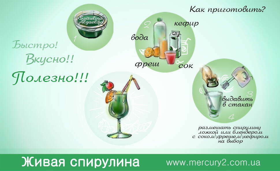 Цена коктейля складывается очень легко= цена порции спирулины+порции сока/кефира/...(либо их комбинации)