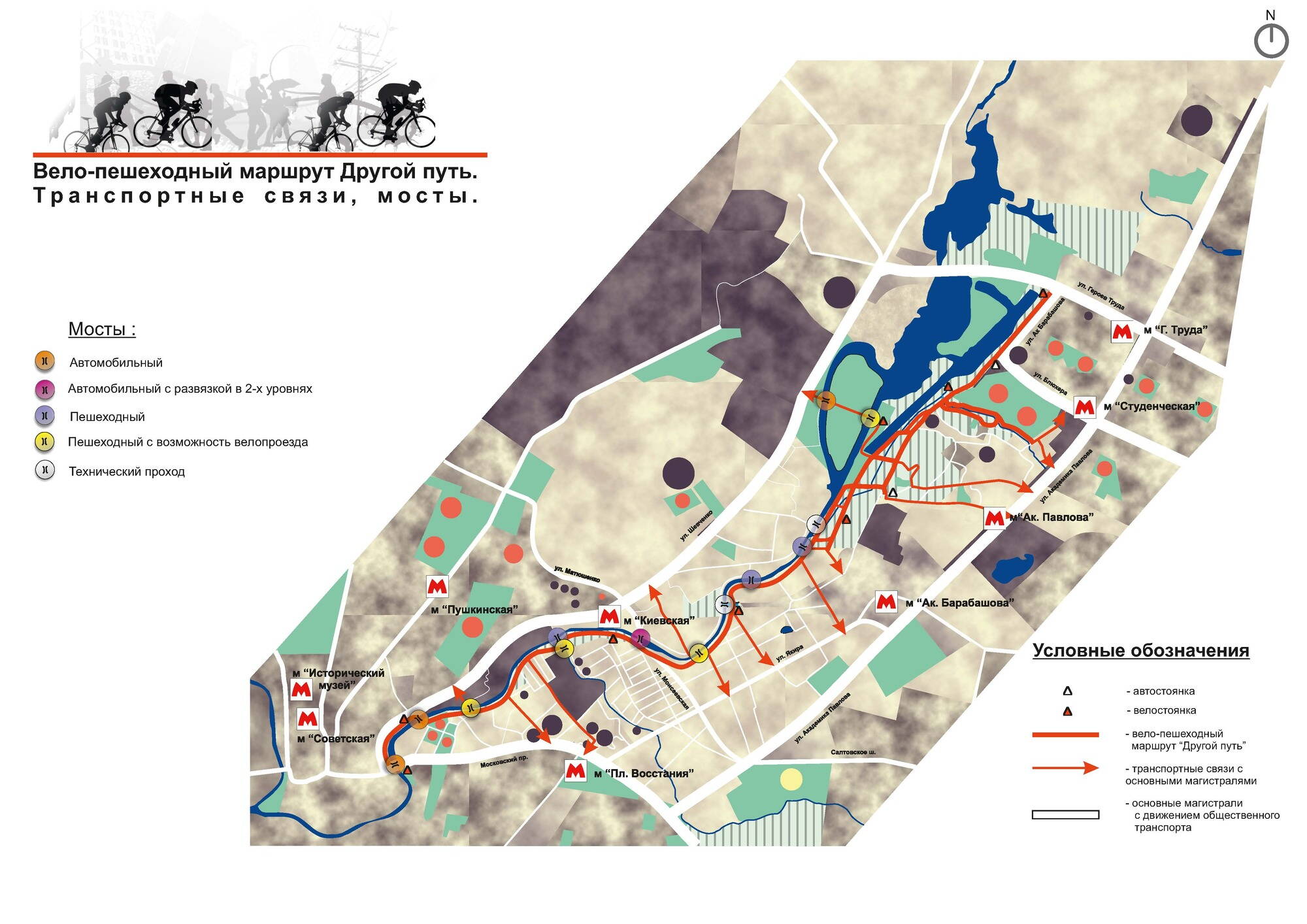 Другой путь представляет собой маршрут для вело-пешеходного движения соединяющий крупный спальный район города "Салтовка" с центром.