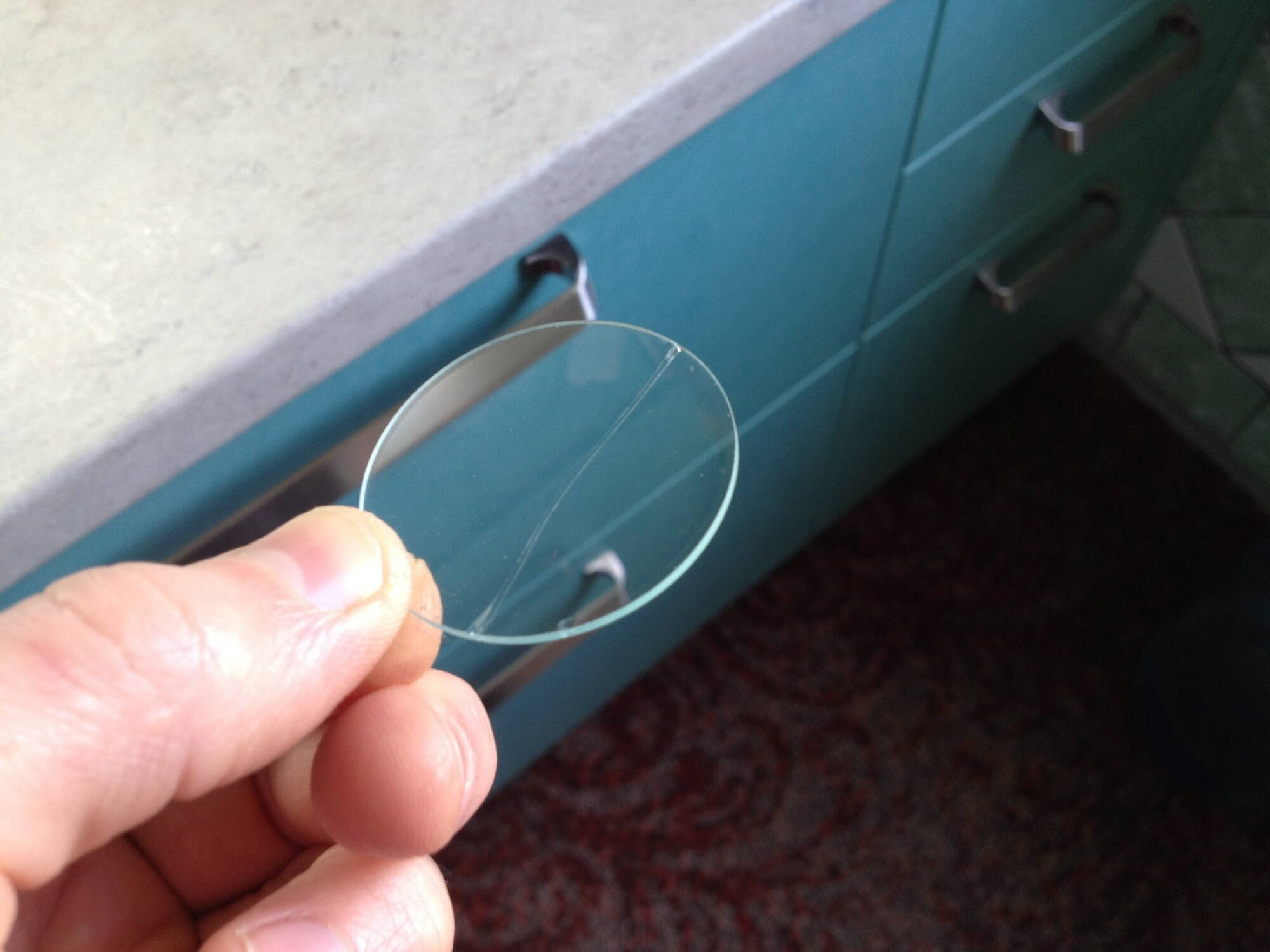 Судя по тому что сквозь стекло на снимке ничего не увеличивается и не уменьшается - это простое стекло а не линза. Не стоило возиться со склейкой, практичнее было бы сделать как я выше написал: вырезать из прозрачной крышки от CD кругорезом или просто лобзиком