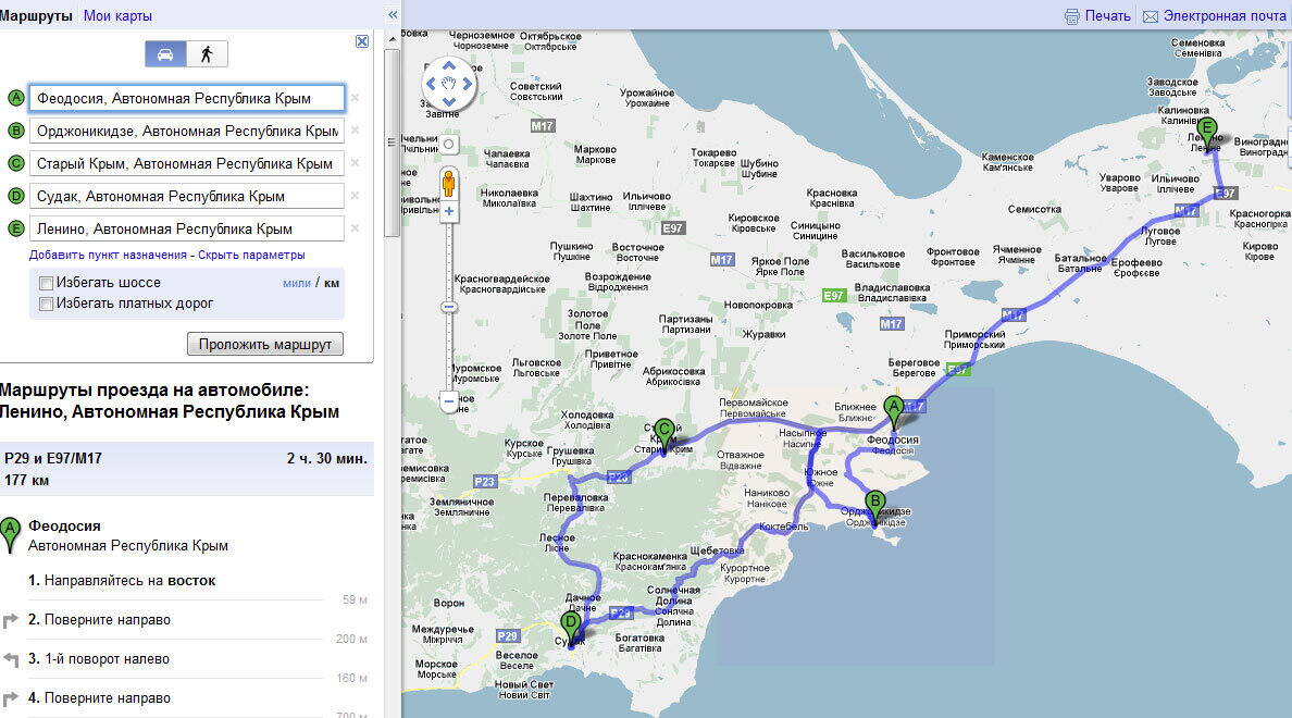 Если осесть в Феодосии, или в любом другом городе, то можно делать радиальные выезды. К примеру во такая карта: