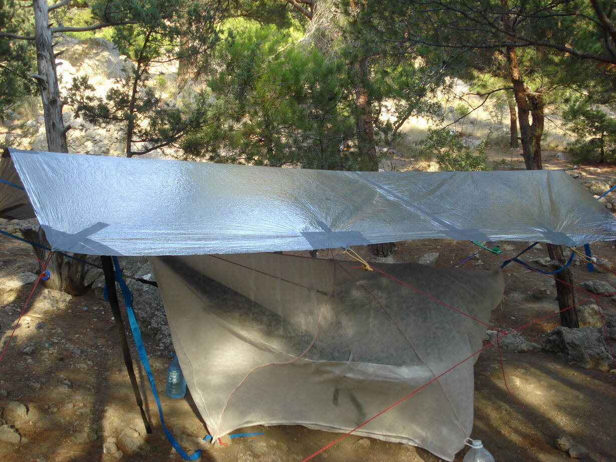 Знаю любителей постоять около моря с палаткой, они брали в секонде самые дешевые белые простыни и ими накрывали палатки. Сам думал, что это не поможет, но они даже днем в палатках спать умудрялись. Так что... сам не пробовал... но как вариант. Хотя вес у таких простыней не маленький.