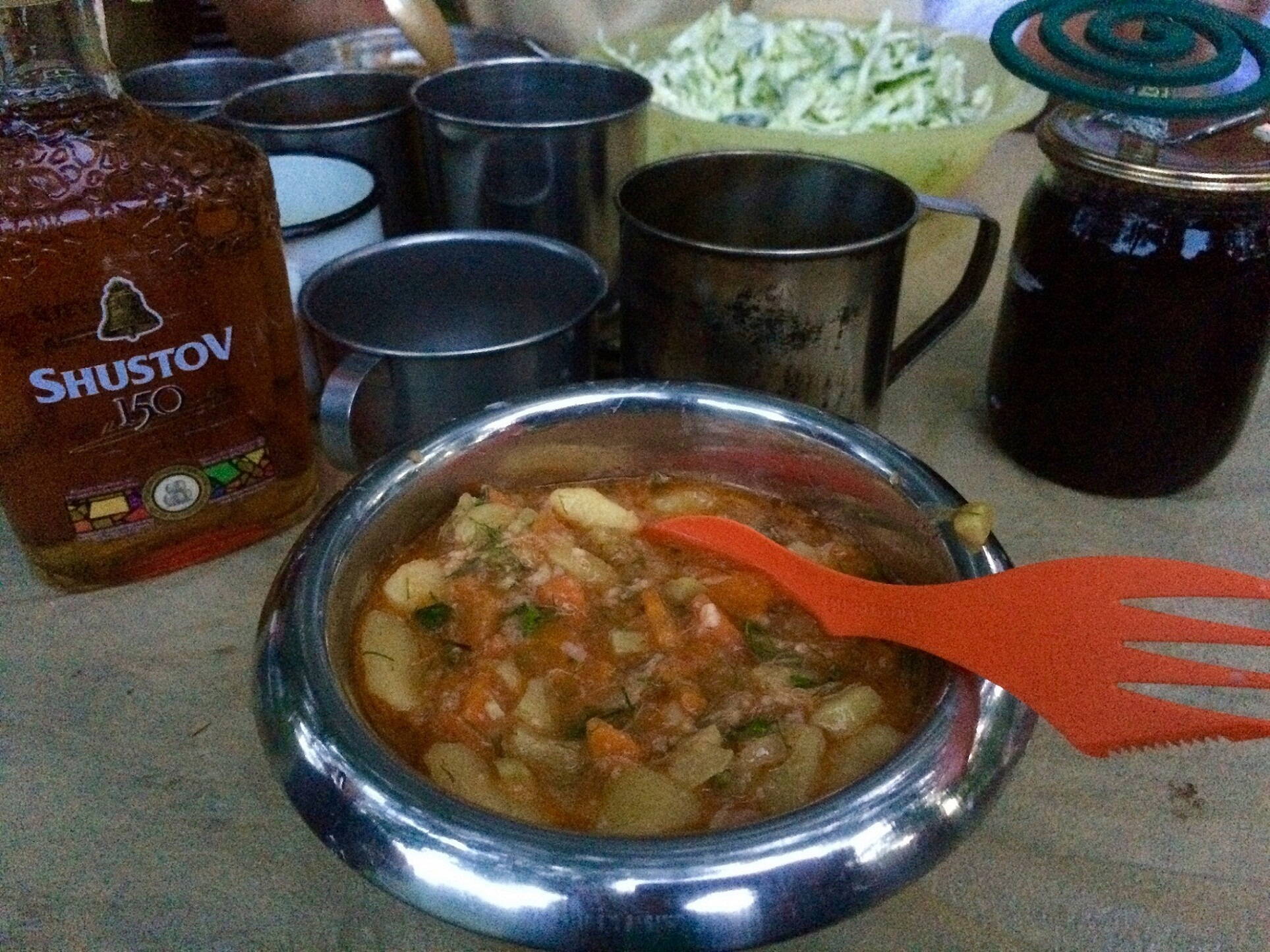 Ещё про кашу. Рецептов много, вот вам и мой. Разводим огонь ставим котелок с водой (у меня на 9литров), пусть кипит. Пока костровой разводит огонь, повар чистит 4-6 крупных картошин и режет их кубиками 1,5-2см. Как только картошка порезана сразу кидаем её в котелок, не дожидаясь пока закипит вода. Следом чистим и режим полу(или четверть)кольцами пару морковок. И сразу в котелок следом за картошкой. Пока вода закипает начинаем готовить зажарку. Сало (брать желательно с прорезями мяса, ошеек (то которое твёрдое) грамм 200-300нарезаем кубиками 2 -2,5см и на сковородку. Обжариваем на большом огне, чтоб подрумянилось а не стекло жиром. Когда обжарили до золотистого цвета (не до шкварок) бросаем на сковородку кубиками нарезанный лук (2-3луковицы покрупнее). Доводим до золотистого цвета и в котелок. Ложкой можно зачерпнуть горячей воды из котелка и вылить на сковородку, воду с остатками жира сливаем обратно в котелок (сковородка чистая и продукт весь в деле). Дальше ждём пока картошка дойдёт до полуготовности и засыпаем пачку пшена (пшено тяжелое на желудок, но с картошкой, луком и морковкой будет самое то). Тушенку (1банка говядины, 1банка свинины) в банке нарезаем ножом, чтоб всем досталось по кусочку, и в котелок. Теперь заливая или раздувая пламя, закрывая и открывая крышку следим чтоб выкипела лишняя вода и не подгорела каша, помешивание приветствуется, но не обязательно, всё зависит от котелка. Когда каша сварится добавляем специи и соль (мне нравятся приправа «10 овочів»). Далее плавно помешивая кашу, не снимая её с огня, вливаем 10 яиц, предварительно размешанных ложкой в миске. Добавляем 1пачку сливочного масла. И много нарезанной зелени (петрушка, зелёный лучёк), перемешиваем. Через 3-5 минут снимаем с огня. Накрываем крышкой, даём настоятся минут 10. Всё! ПО МИСКАМ!!!!