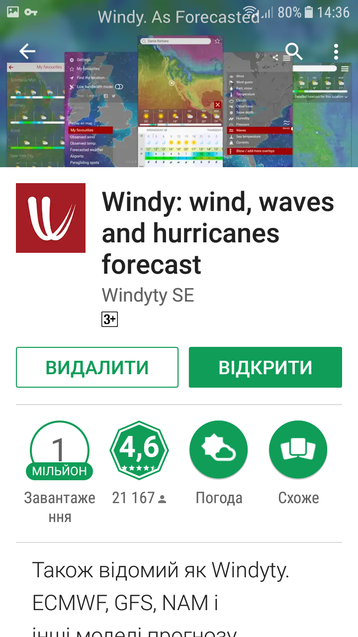 Попередні, котрі я був поставив, мені також не сподобались і я їх викинув.( вони всі називались windy). А на цьому хоч інтерфейс на українській (російській) і більш зрозуміло. Я кілька днів уже користуюсь, щоб звикнути і мені сподобалось. Провіряв, як прогноз ( в основному вітер, адже готуюсь до моря) то майже відповідає дійсності. На цьому сайті https://www.meteoblue.com/ru/%D0%BF%D0% ... 90_8096494 поверхово ознайомився що це за моделі погоди NEMS, ICON, GFS і прийшов до висновку, що потрібно вибрати ту модель, яка показує вірніше. А в цьому додатку є можливість дивитись порівняльну картинку усіх моделей разом. В приципі я пока задоволений. Перевірку показів здійснював протягом 2-х днів під час велопрогулянки на 50-60 км на різних ділянках траси. Відповідає!