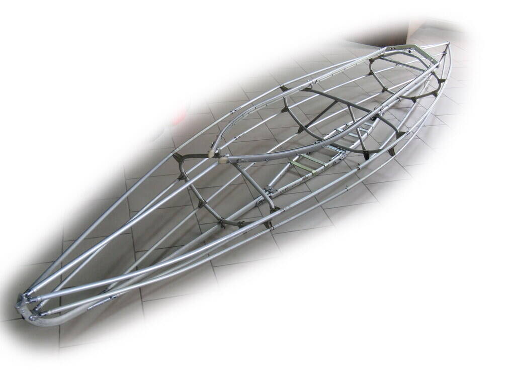 Знаю, что из трешки делают двушку, но тащить ее одному с рюкзаком очень тяжело. На переделке в однушку думаю выиграть 10-15 кг при самодельной новой шкуре из ПВХ. В коридоре собрал носовую и кормовую часть, и пятая точка подсказывает, что придется сделать полностью новый укороченный разборный кильсон, а средний шпангоут (на фото установлен не самый большой 3-й, а 2-й) лучше сделать поменьше для плавности обводов. На форуме не нашел, но, может, у кого есть такой опыт, идеи?
