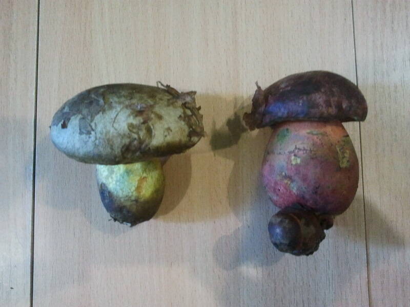 Вот эти 2 вида боровиков попадаются часто. Изначально я думал что все это сатанинский гриб. Его я варю минут 20 и ем, хотя пишут что его варить надо 10 ч. Оба синеют на срезе. Немного пошарив в интернете, теперь думаю что слева "Несъедобный боровик" либо "Болет красивоножковый", хотя у моего ножка полностью желтая, а у этих красноватая. А тот что слева я так и не определил. То ли это "Дубовик крапчатый", то ли "Боровик прекрасный", то ли "Боровик двуцветный", то ли "Болет пурпурный"
