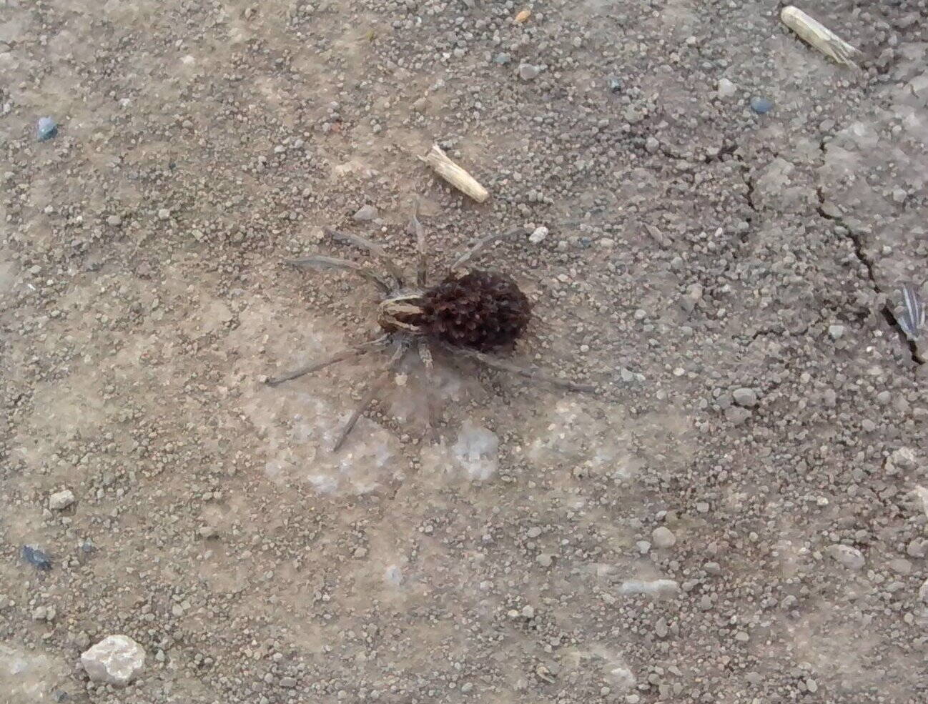 Это самка кого-то из пауков-волков (Lycosidae sp.) "Каракуль" на брюшке - это мелкие паучата, которых самка расселяет по окрестности (тупо сгоняет с брюшка по одному-двое ударами задних лап, когда какое-то место кажется ей подходящим). В этом семействе довольно много видов пауков - в том числе и знаменитые тарантулы.