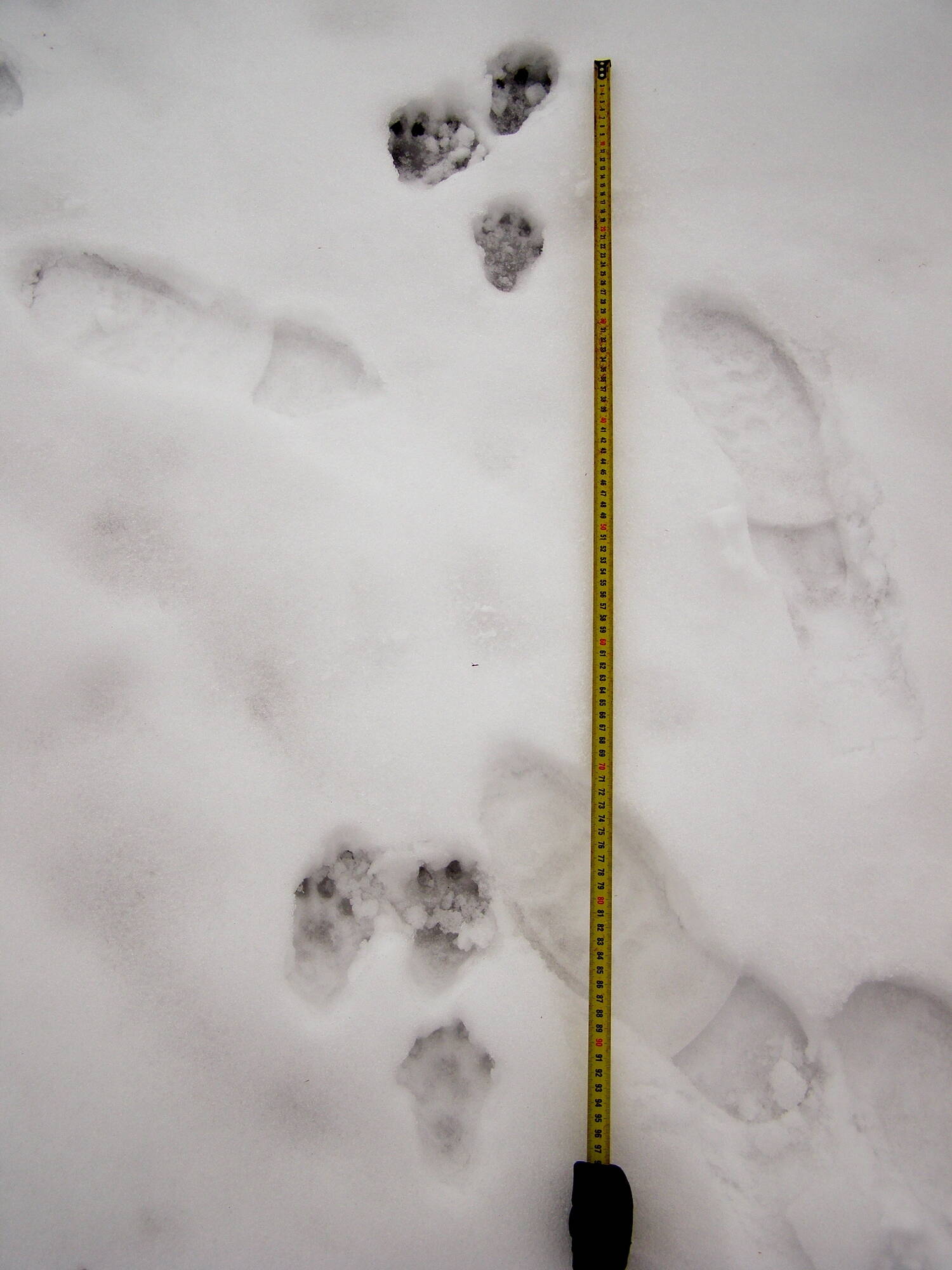 Первый палец часто не отпечатывается, особенно у передних лап, зато даже на не очень глубоком снегу обычно остается борозда от хвоста.