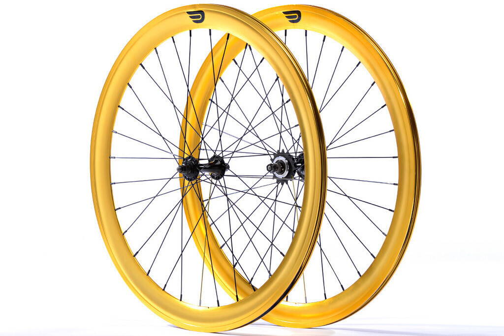 Набор колес (переднее и заднее) Pure Fix с высотой профиля 50 мм. Изготовлены из алюминия с двойной стенкой, размер - 700C (28"). Колеса оснащены втулками KT Quando. На заднем колесе размещена двухсторонняя втулка flip-flop с установленной фиксированной звездой 15Т и звездой 16Т со свободным вращением для езды в режиме single-speed. На каждом колесе размещены 32 спицы. Наборы оснащены нейлоновыми лентами для защиты камеры.