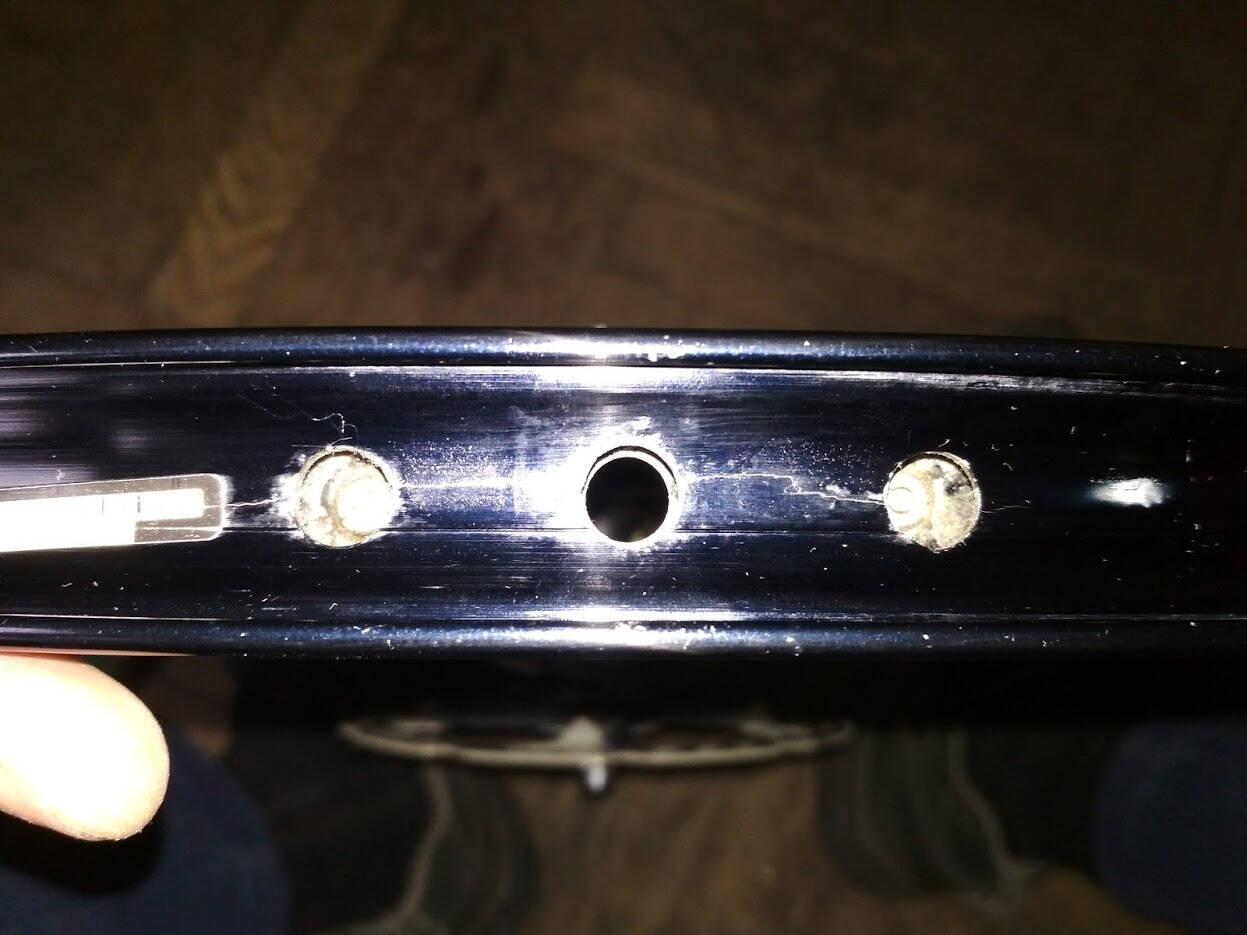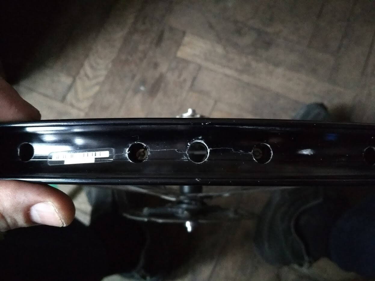 Заднее колесо,обод Мавик 317,восемь лет зимней соли...Перед зимним сезоном решил обновить ободную ленту на нём (впервые за 8 лет),при этом высыпалось белого оксида большая куча.Думал,что этот сезон успею доездить.Таки да,успел - вчера в лесопарке вырвало первую спицу: