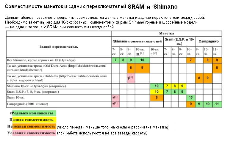 Ниже ссылки на темы и таблицы перекрестной совместимости манеток и переключателей (полной либо частичной) фирм SRAM, Shimano и Campagnolo и выдачу троса на одну передачу в миллиметрах.