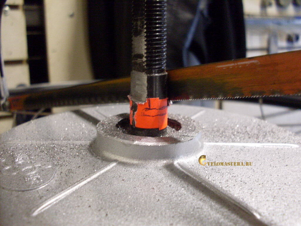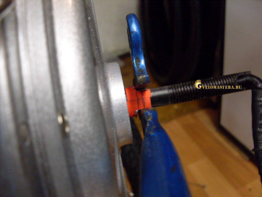 Опыт по переделки таких велосипедов в электро у меня уже был, так что как только к попалась симпатичная рама Старт-шоссе работа закипела. (таким же способом можно переделывать велосипеды Турист / Спорт / Чемпионы / Спец Заказ / Украина / Урал и т.д.). Предыдущий велосипед собирал я год назад. Сейчас на нем катаются на Кипре наши соотечественники. Был взят штатный мотор-колесо мощностью 250 вт. (макс. мощность 36Вт х 17А = 612 вт.) Специально был взят не мощный мотор, что бы увеличить максимально дистанцию пробега. Сейчас мотор-колесо достать не проблема было желание. К мотору я применил операцию даунгрейда (удаление нужных деталей) удалил с левой стороны бобышку с резьбой и прорезал ость. Все это сделано было для уменьшения рабочего отрезка втулки. Колесо заспицевал на двойной обод спицами ДТ. Установил пятерник 13-26 зубов. Рабочий отрезок в месте с пятерником составил 135 мм. Пришлось разгибать задние перья рамы. С помощью двух струбцин все операция проходит за 10-15 минут. Устанавливаем колесо и закрепляем моторный провод с левой стороны к раме велосипеда пластиковыми хомутами. Вот и пол велосипеда собрано. Перекур.