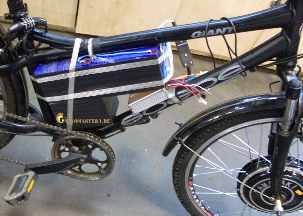 Батареи можно ставить любые - главное емкие и легкие. Надо три штуки по 12 вольт. Мотор-колесо работает от 36 вольт. Хотелось поставить литий, но он еще не доставлен был. Пришлось ставить (народные) гелиевые аккумуляторы. Знакомый скорняк за месяц с небольшим сшил мне кожаную сумку в стиле (байкер). Метод крепления и размещения аккумуляторов АКБ подходит на многочисленные рамы (классический треугольник) велосипедов. За основу блока на 36 вольт был взят принцип треугольника. Два АК вверху, а один внизу. Такое размещение (с 5 до 9 Ампер емкости при 12 В) позволяет воспользоваться стандартными вело сумками в качестве защиты от дождя и снега, придав ему красивый внешний вид. При емкости АК от 10 до 15 Ампер приходится прибегать к самодельному дизайну. Тот же принцип треугольника работает и тут. Возьмите два алюминиевых уголка и приклейте их к снизу аккумуляторов силиконовым или другим клеем (как на фото). Два АК закреплены жестко между собой к ним крепится третий АК через прокладки на герметик и вся конструкция обматывается обычным скотчем, а затем сантехническим скотчем. К раме вся конструкция крепится стальными хомутами. Батарею для красоты можно обклеить либо подобрать сумку под нее.