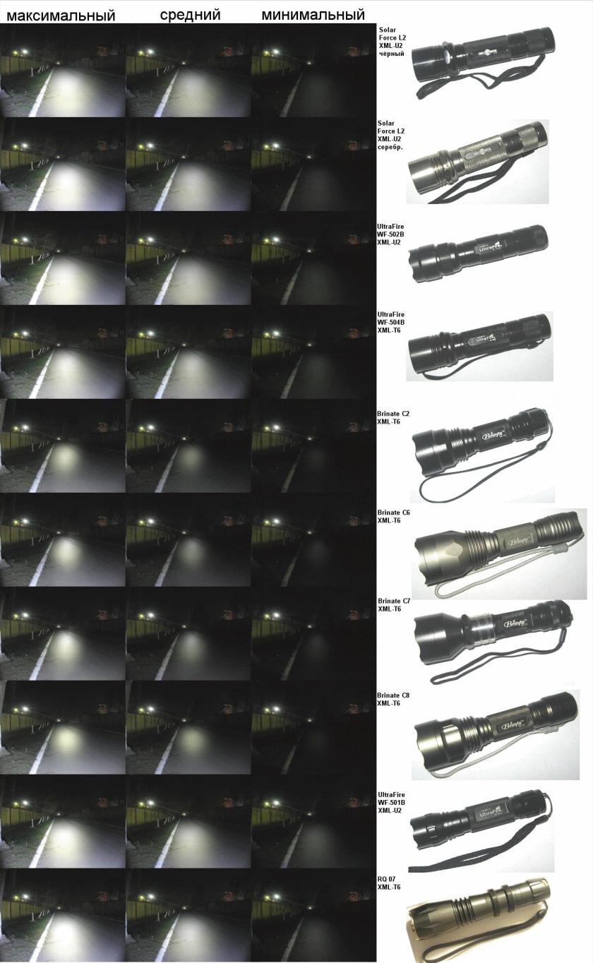 Сравнительная ФОНАРЁВКА фонарей на светодиоде XML, перечисленных на предыдущей странице, для наглядности есть и "народный" SF-15 на диоде Р7 и самый доступный UltraFire WF-501B на XPG-R5:
