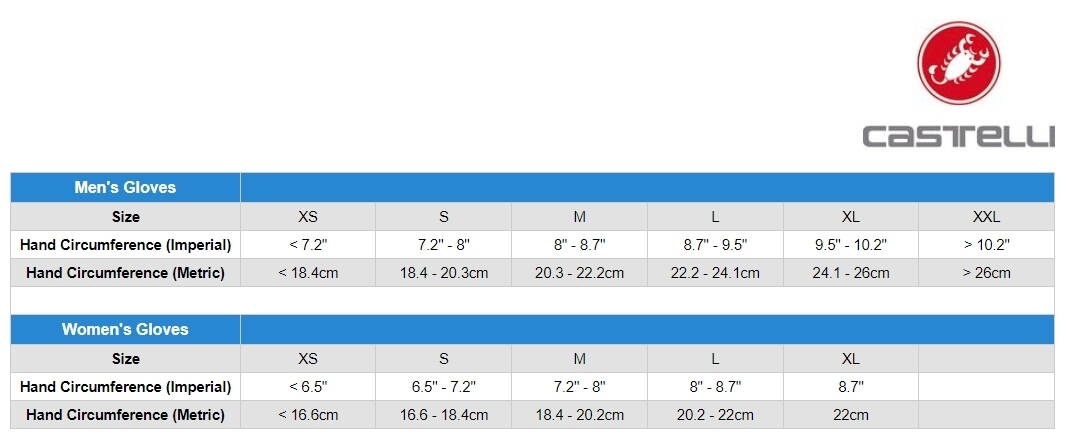 Примітка: розмірна сітка велоперчаток Castelli зазвичай йде на 1 розмір менше, ніж у більшості інших брендів, обов'язково звіряйте розмірну сітку перед замовленням!